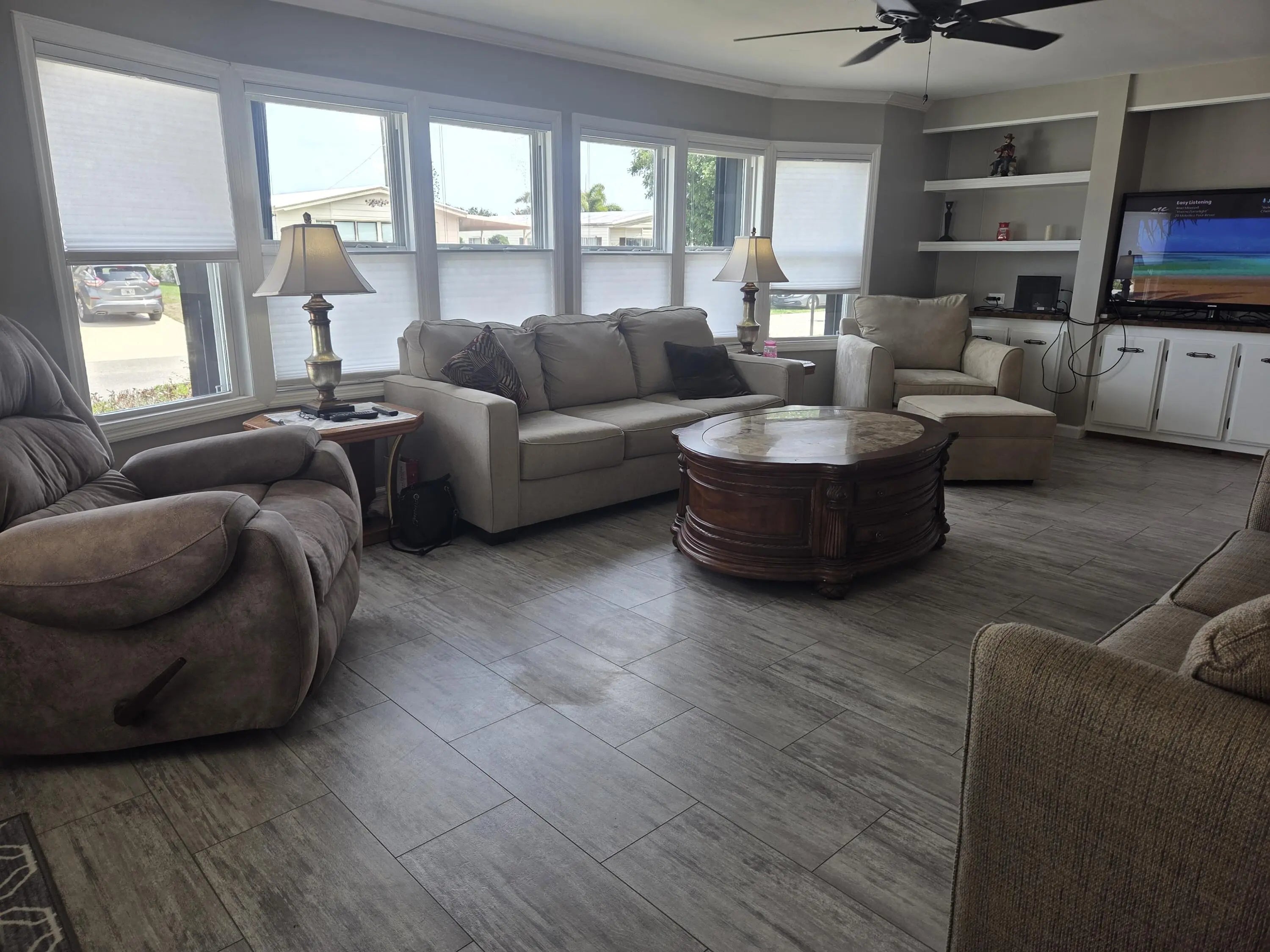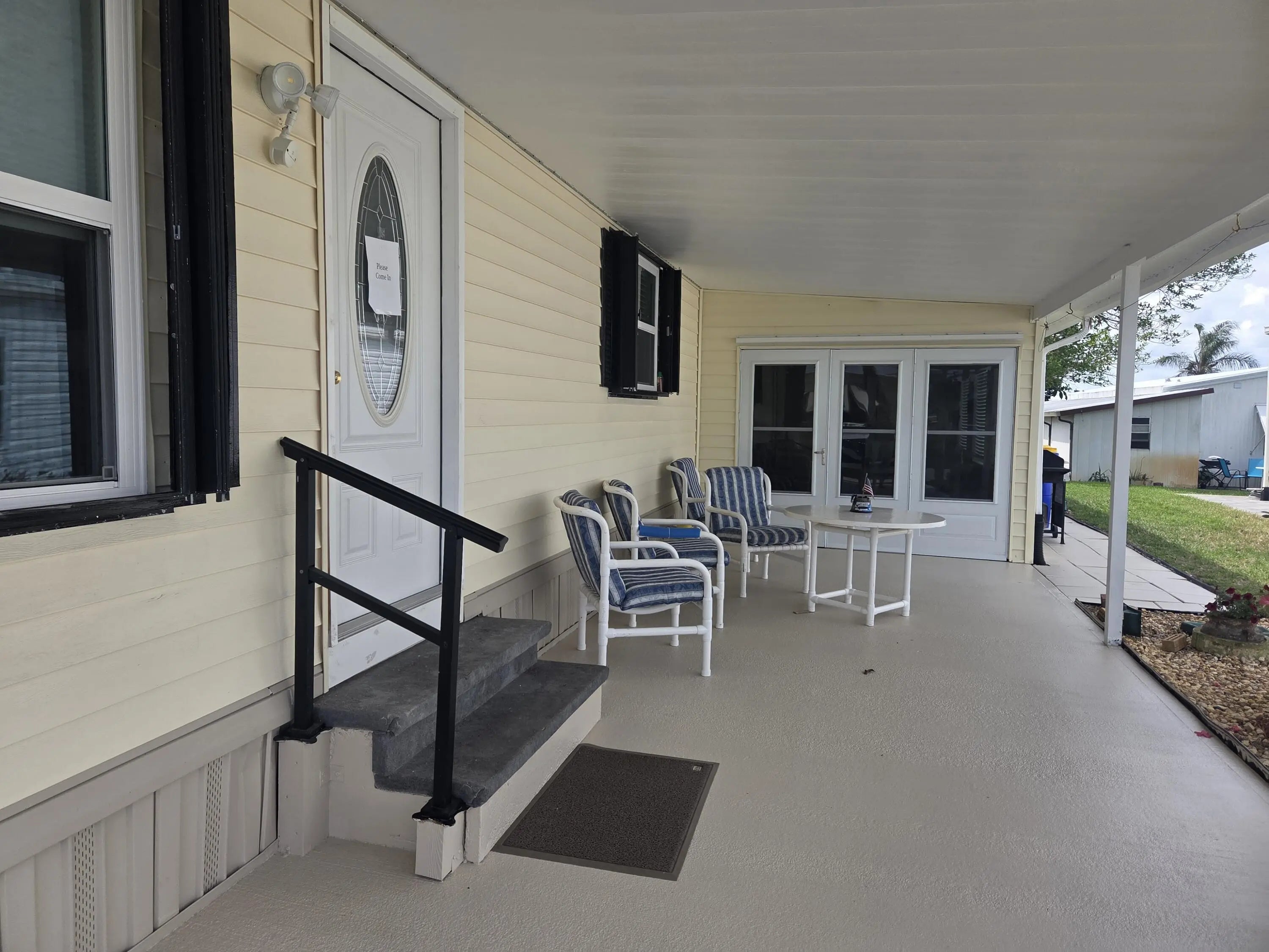 This beautifully designed manufactured home offers a carefree lifestyle and you OWN THE LAND. Home is completely transformed with a renovated kitchen, 2 baths and new lvp flooring. New appliances ,electrical subpanel, irrigation pump, new windows and storm protection are included. Prepare for an easy transition as this home comes complete with furniture, TURNKEY. This home features a large attached shed with a convenient golf cart entrance. Cambridge is close to shopping, beaches, medical, restaurants, boat ramps. Minutes to I95, and 35 mins to PBI airport. Pet friendly, and loads of amenities, this community is the one!! Whole house Accordion shutters Florida room and triple doors have metal shutters 2015 New Aluminum roof 2017 New A/C 2020 New windows 2020 new custom shades Living room 2020 New Washer and Dryer 2021 New Baths 2023 New Kitchen with Granite counter tops and appliances 2023 New mini split Florida room 2024 New Floors with all new sub floors 2025 New sprinkler pump 2026 New Sub Panel