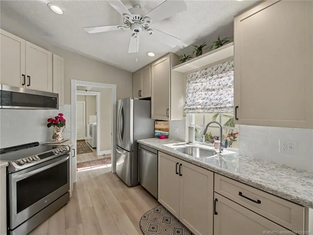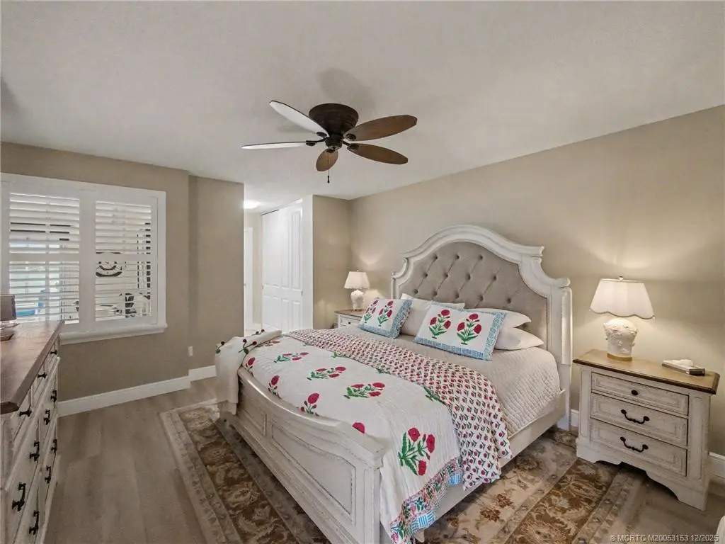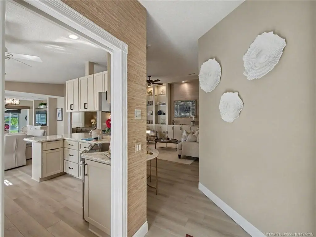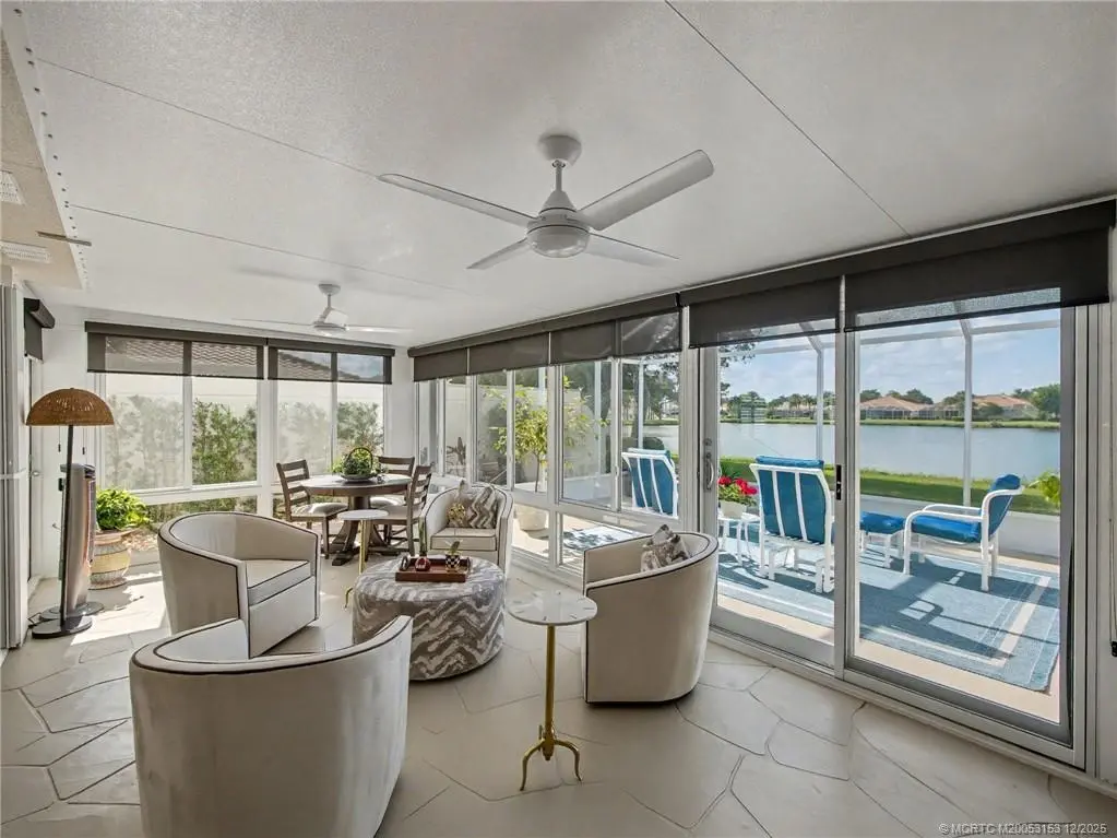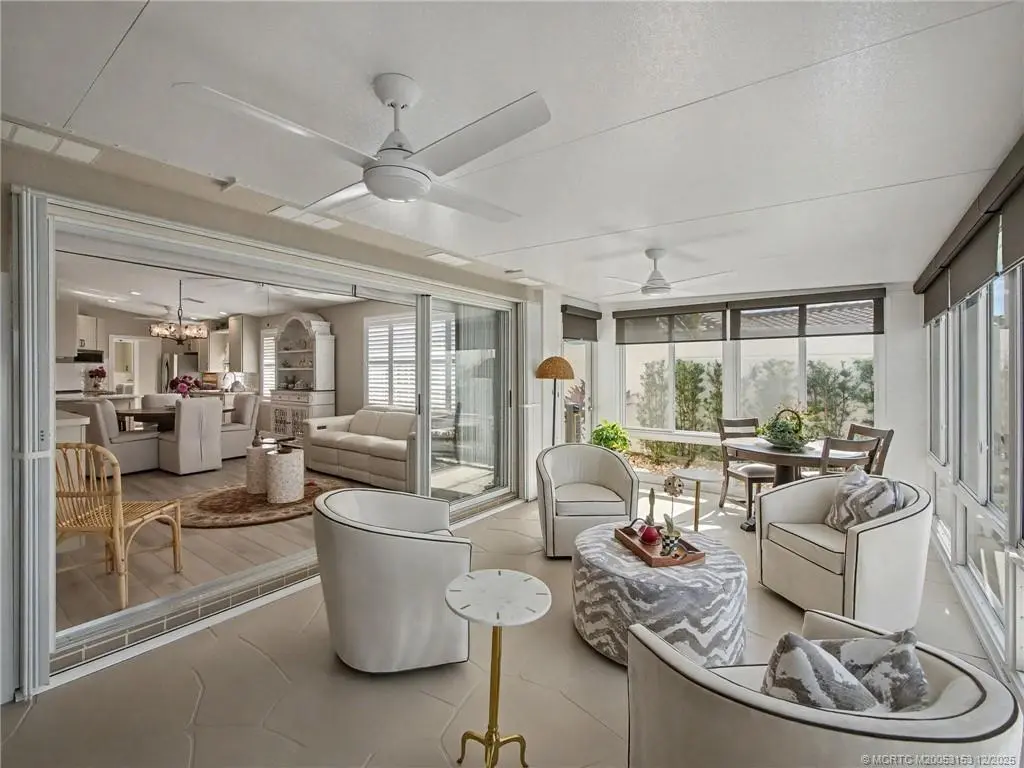 Must see! One of a kind enclosed 300 square foot Sunroom! with separate climate control by remote. This lovely 2 bedroom/2 bath home move in condition , Luxury vinyl flooring Master bath tiled and painted neutral colors, all new Quartz counters tops, LED high hat lighting. Kitchen with LG stainless French door refrigerator and oven with Whirlpool low profile microwave. Master and Guest bathrooms completely renovated. Gorgeous hurricane rated sunroom with custom UV shades A/C and two ceiling fans. Maytag large capacity washer and dryer. All entry doors replaced with hurricane impact coding. Garage door reinforced. Hurricane Shutters, Portable Generator with direct access to panel box. Replaced all necessary plumbing. 2024 A/C Copper Coil, Roof 2019, Hot Water Heater 2015,, Community offers 2 swimming pools, tennis, bocce ball, sidewalks with streetlights, newly remodeled club house and private golf course: membership available. For Apt. call 772.341.2510 Barbara Holland