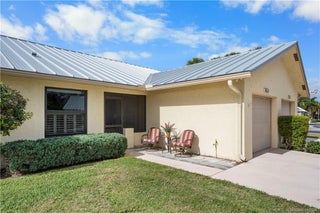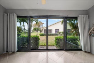 Neat and inviting, this 2-bedroom, 2-bath, 1306 sq. ft. villa is located in the desirable 55+ community of Sugar Sands. Vaulted ceilings enhance the open floor plan, creating a bright and airy living space. The kitchen features white cabinetry and stone countertops, seamlessly flowing into the living and dining areas. The primary suite offers an ensuite bath and a large closet with wood shelving. Relax and enjoy peaceful green space views from the enclosed lanai with impact glass. Added peace of mind comes with hurricane shutters and partial impact glass (2025). The low HOA fee includes cable TV, lawn care, a community pool, and ample boat or RV storage. Ideally situated just minutes from the beach, I-95, shopping, dining, and charming downtown Hobe Sound.