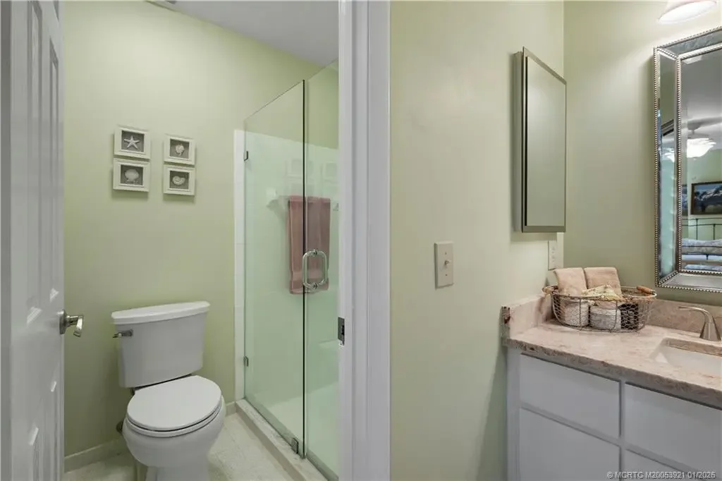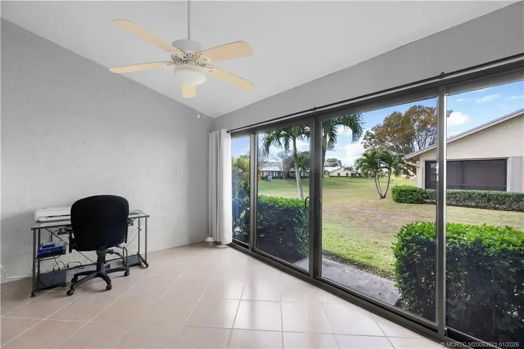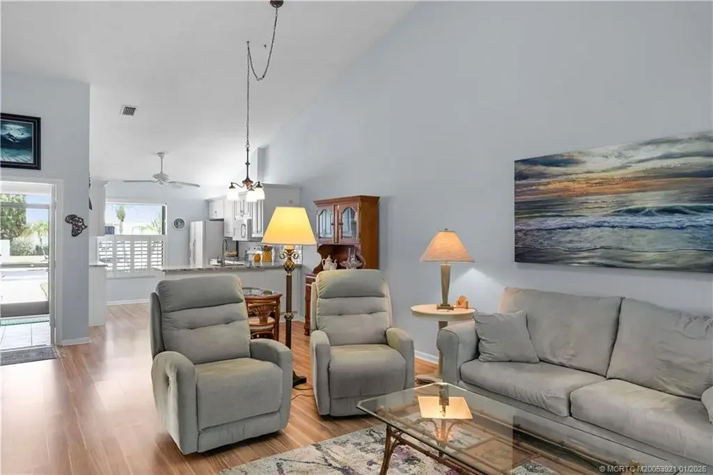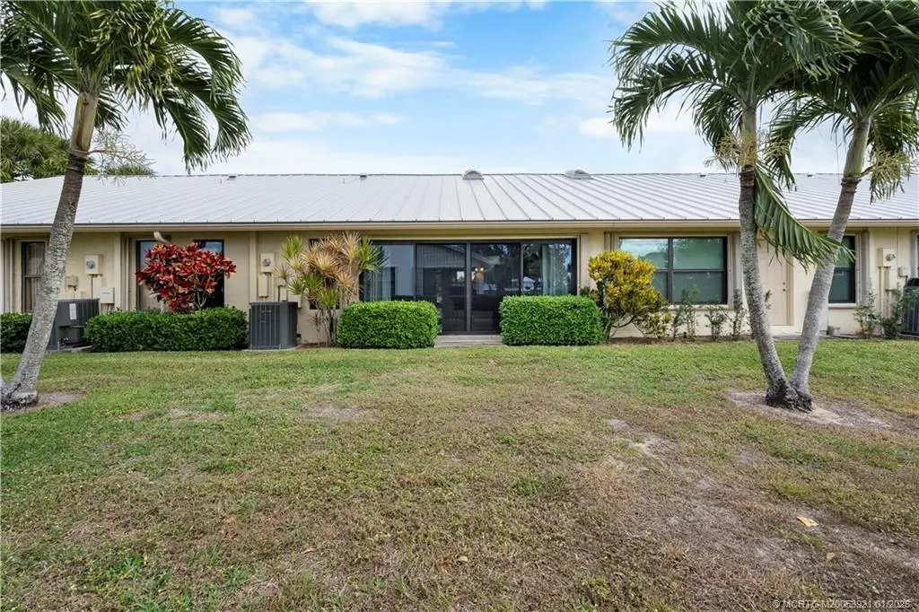 Neat and inviting, this 2-bedroom, 2-bath, 1306 sq. ft. villa is located in the desirable 55+ community of Sugar Sands. Vaulted ceilings enhance the open floor plan, creating a bright and airy living space. The kitchen features white cabinetry and stone countertops, seamlessly flowing into the living and dining areas. The primary suite offers an ensuite bath and a large closet with wood shelving. Relax and enjoy peaceful green space views from the enclosed lanai with impact glass. Added peace of mind comes with hurricane shutters and impact glass in vast majority of the home (2025). The low HOA fee includes cable TV, lawn care, a community pool, and ample boat or RV storage. Ideally situated just minutes from the beach, I-95, shopping, dining, and charming downtown Hobe Sound.