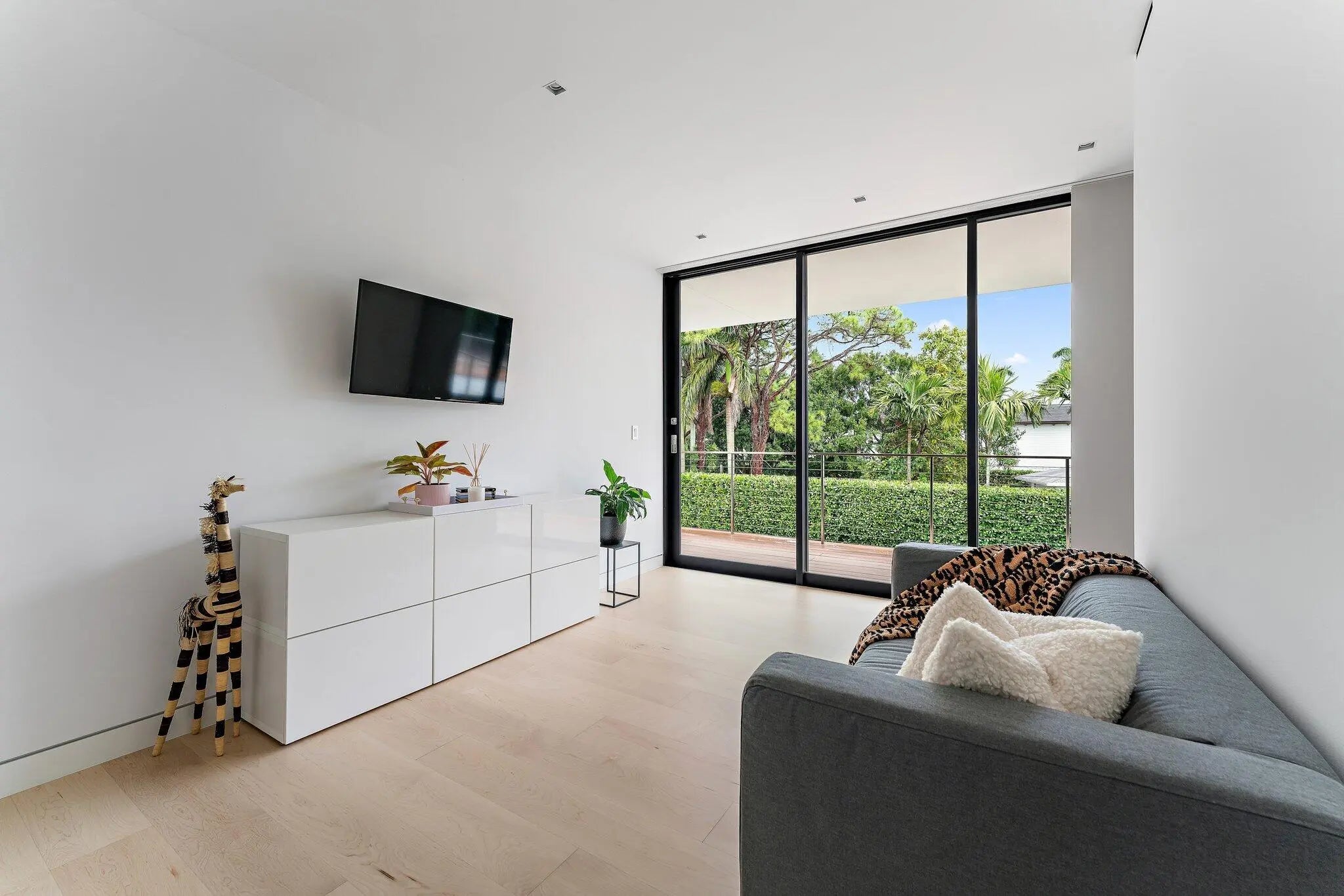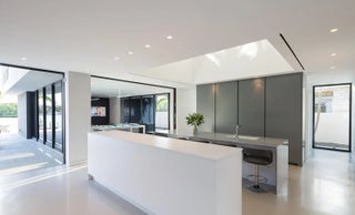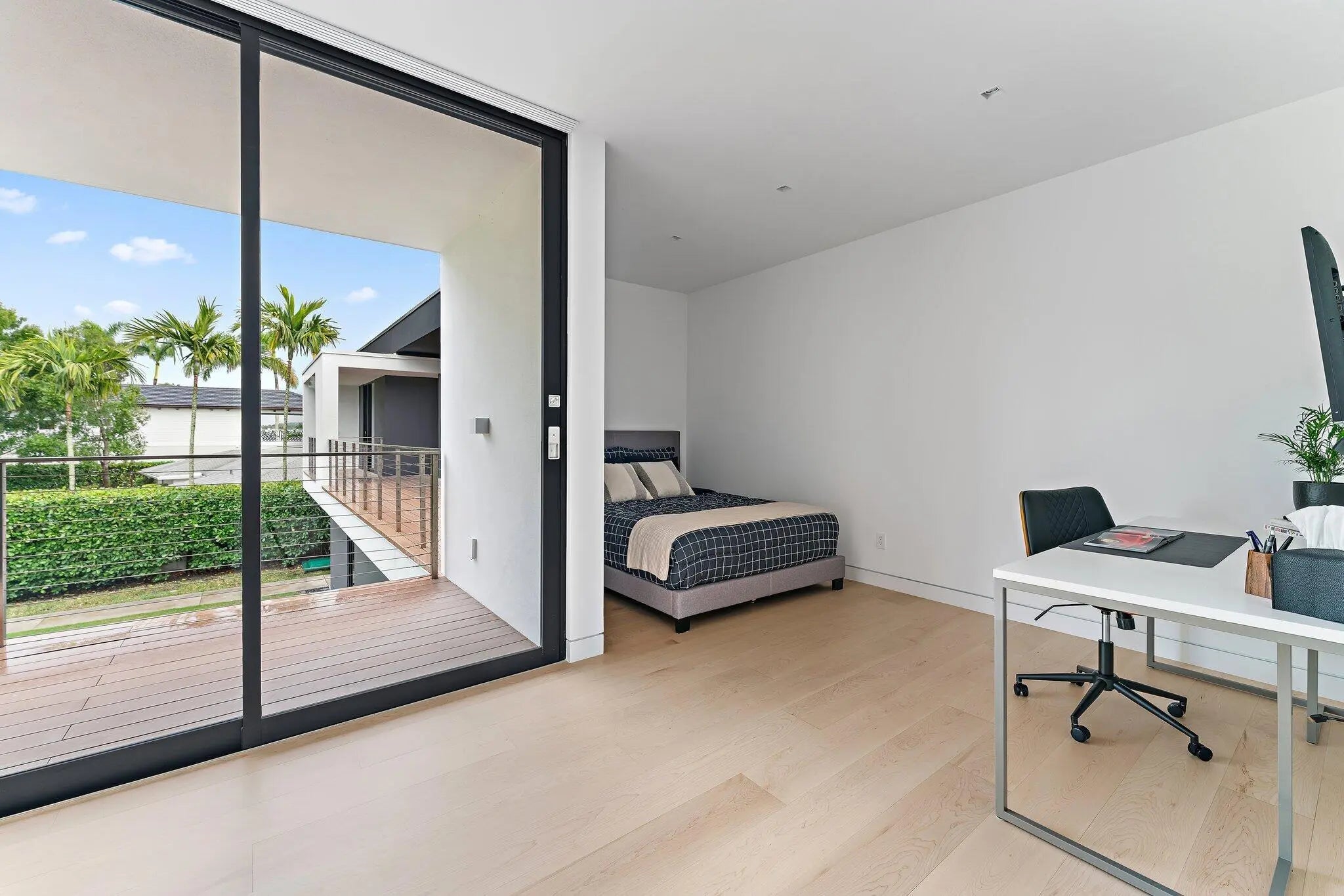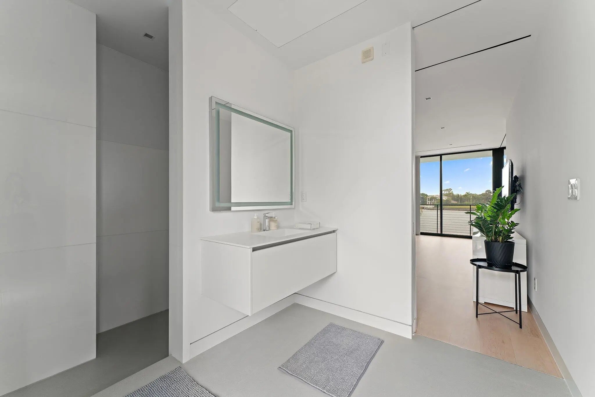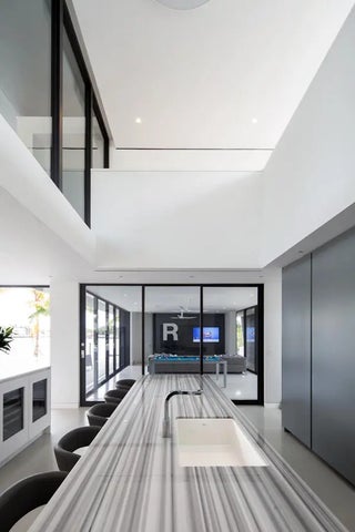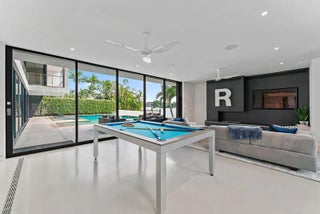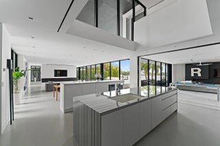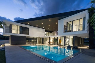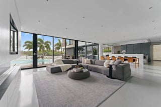 HughesUmbanhowar Architectural Masterpiece on the Loxahatchee River. Featured in Modern Luxury Interiors South Florida and Palm Beach Illustrated. 4 en-suite bedrooms in total/2 half baths featuring a private en-suite guest wing. Privacy and modern elegance combine to make this home one of the finest in Jupiter. Situated on a private 0.6-acre lot, this thoughtfully designed estate offers breathtaking water views and deck access from every room. Abundant natural light accentuates the home's clean architectural lines and outdoor connection. With a striking white and gunmetal palette carried seamlessly throughout the interior and exterior, the architecture itself becomes the home's defining artwork. Offered fully turn-key, the home is furnished with custom pieces by B&B Italia, Luminaire and Design Within Reach. The fully outfitted kitchen is complete with custom walnut cabinetry, a Bertazzoni cooktop, Miele appliances, and a dramatic Wagamama waterfall marble island-creating a truly effortless move-in experience. Spanning 5,099 square feet of harmoniously designed living space, the home features meticulous hardware-free, soft-close cabinetry and concealed appliances that allow the kitchen to blend naturally into the surrounding living and dining spaces. A sophisticated architectural lighting plan by Delta Light, thoughtfully layered with recessed fixtures, enhances the home's modern aesthetic and beautifully highlights its clean, minimalist lines. Complementing this design, sleek circulation grills and linear slot diffusers provide optimal air movement while maintaining the home's refined look. The first floor is finished with terrazzo floors with a modern matte finish, while the second floor transitions to warm, refined wood flooring. The kitchen and living areas, framed by Fleetwood telescoping doors, open seamlessly to a spacious recreational family room, outdoor kitchen, expansive outdoor terrace and a beautifully designed EURO edge salt water pool with built in hot tub, offering an elevated environment for both entertaining and quiet relaxation. The second floor hosts three en-suite bedrooms, each with private balconies, showcasing Resysta deck flooring, and stunning water and estate views. The primary suite features a dual-access wet room-style shower adorned with Robern mirrors. In addition, a separate guest wing across the covered terrace includes its own en-suite flex space, complete with a custom Murphy bed and its own spectacular balcony views. Elevating this extraordinary property is a private dock with a 12,000-pound boat lift (including Jet Ski), protective seawall, and easy ocean access-ideal for enjoying the very best of Jupiter's waterfront lifestyle. With its refined design and uncompromising attention to detail, this exclusive home is the epitome of luxury living in South Florida.