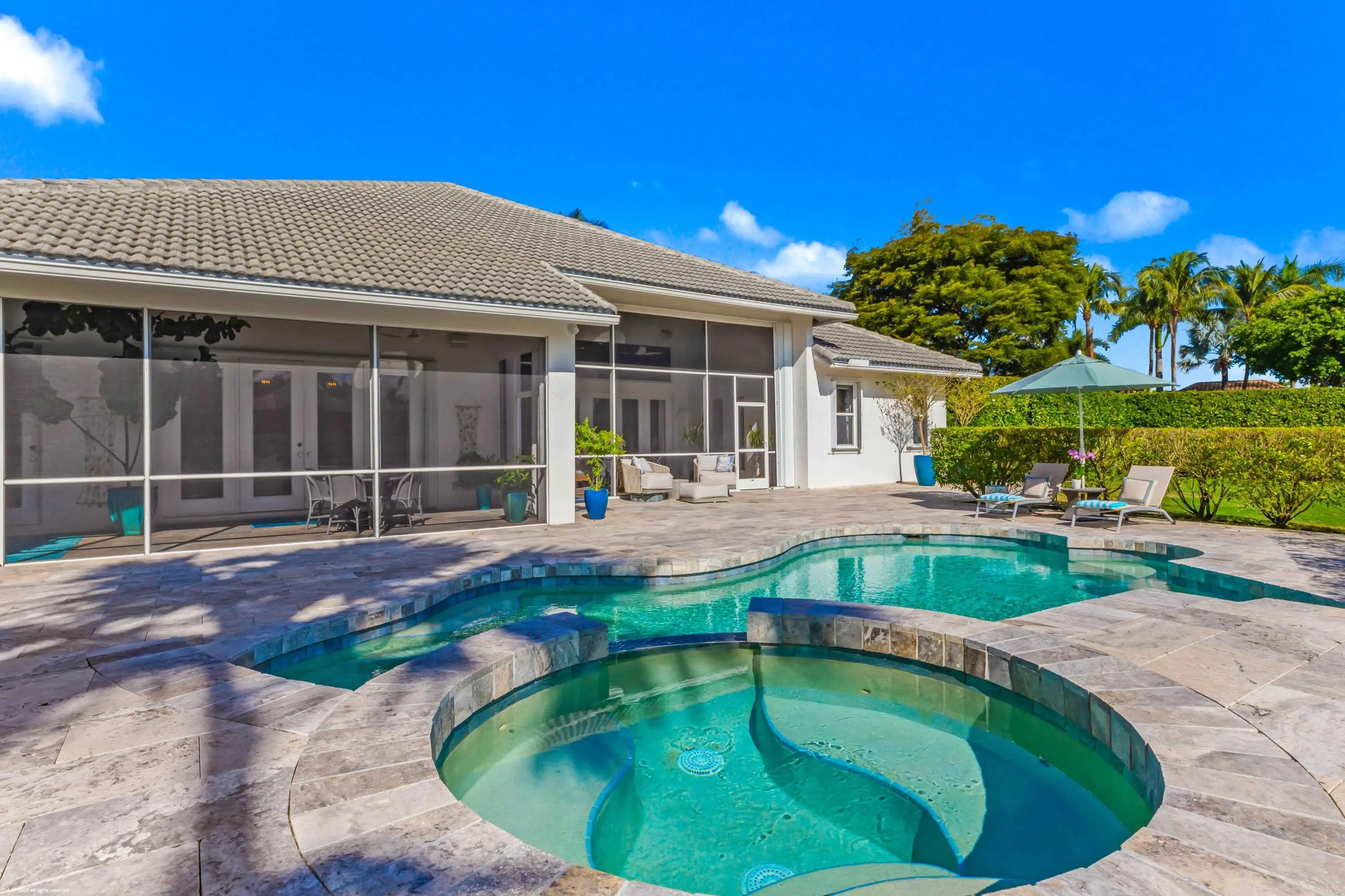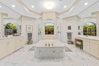 Stunning corner lot in The Equestrian Club Estates. Experience the ultimate in equestrian living. Exceptional 3bedroom/3.1bathroom with 3 car garage. Situated on approximately 0.6 acres just steps away from the Palm Beach International Equestrian Center.The grand entrance features a picturesque circular driveway, setting the tone for the beautiful gardens and lush landscaping that surround the property. Inside, discover a split floor plan with a private master wing, complete with his and hers closets, dual sinks, and a luxurious dual-entry shower. Two additional bedrooms and two bathrooms are tucked away in a separate wing, perfect for guests or family members.Enjoy the high-quality finishes, including marble and wood flooring, a wood-paneled