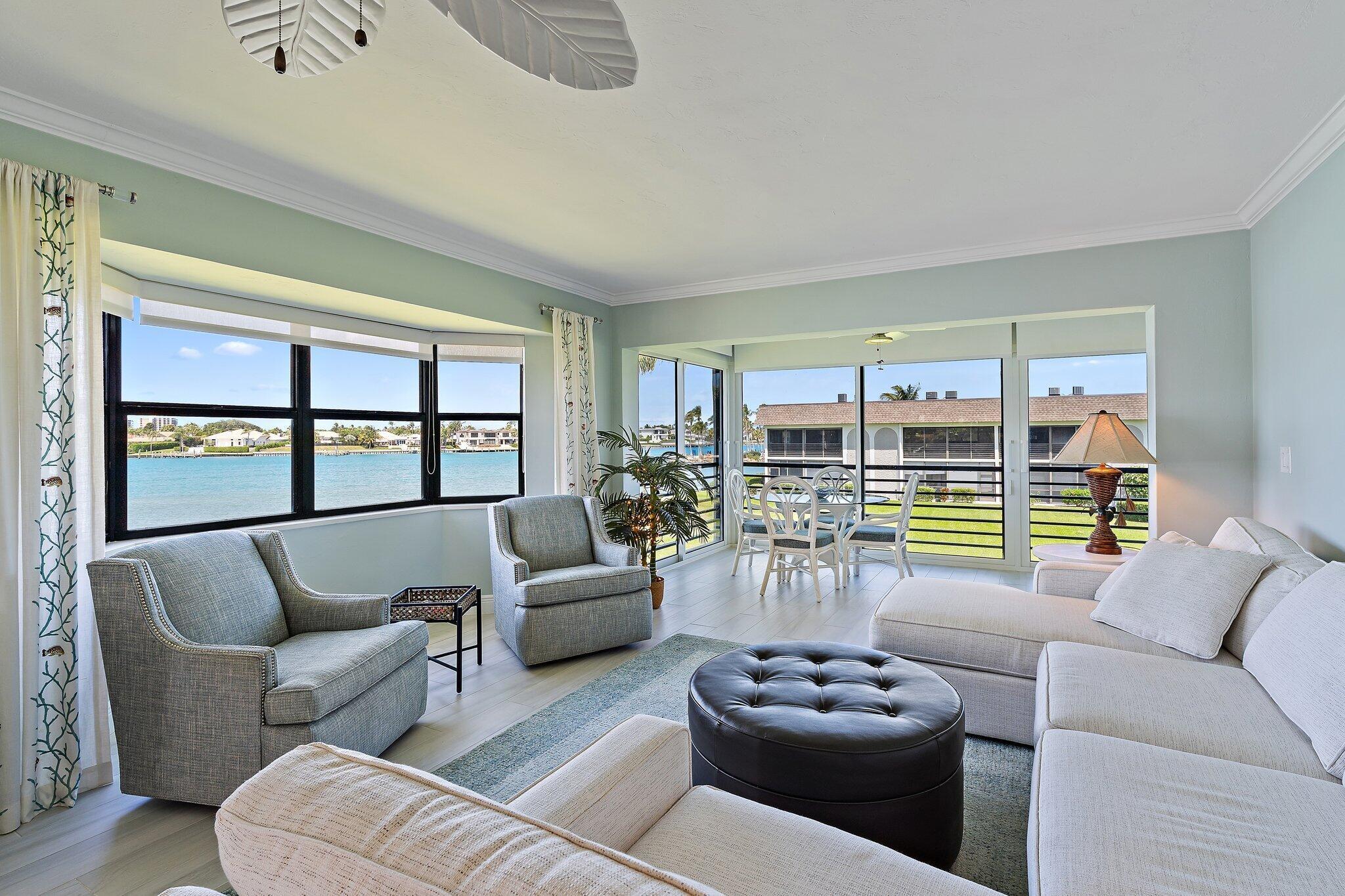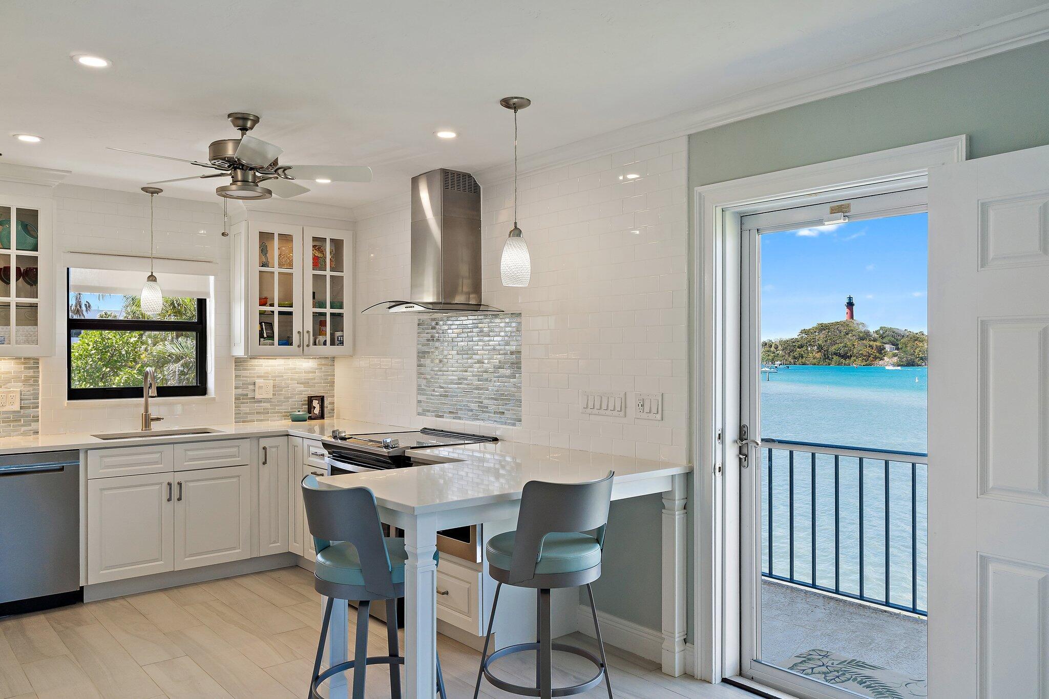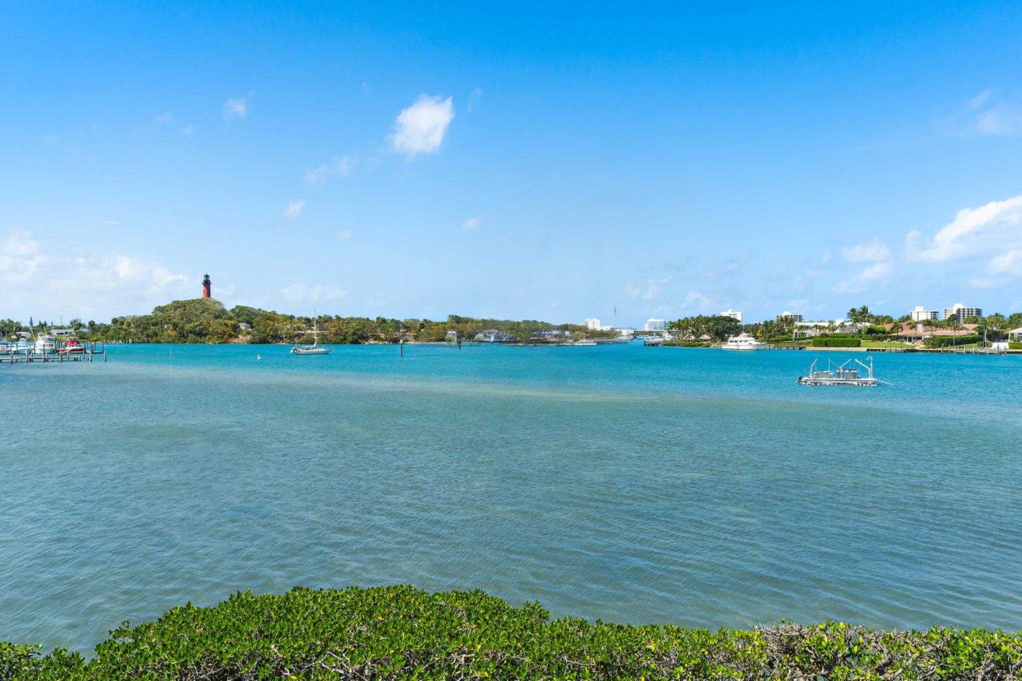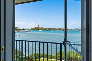 Looking for Million Dollar Views and ''Lock + Go'' convenience that is just around the corner from beautiful beaches, Jupiter's finest Waterfront Restaurants, shops, Boat Slips for lease, golf and more? This condo delivers all 3! Unrivaled Jupiter Lighthouse views + Unforgettable Lifestyle. Truly enjoy this completely renovated end unit with private entry and 180 degree views of the Jupiter Inlet. Entertaining is easy from the gorgeous kitchen that offers plenty of cabinet space, pots and pans drawer, Quartz counters, luxury appliances + breakfast bar. Wonderful open concept with ''Oak'' plank tile flooring, and Impact glass windows + doors that showcase the incredible view. Renovated baths are as pretty as a picture with high-quality tile work, walk-in showers w/ barn door enclosures.Tranquil primary suite is done up in neutral colors and offers a walk-in closet, sliding glass door that opens to the balcony and more views of the Jupiter Inlet. Versatile guest suite w/hide away bed and workspace is perfect for everyday living and visiting friends or family alike. Learn more about this condo & Jupiter Inlet Condos! This fabulous 55+ community is nestled in a park-like setting and provides a large community pool, BBQs, waterfront patio, storage, and "swim" ladder down to turquoise waters to snorkel, swim, fish, or paddleboard. Special Opportunity to Enjoy all that Jupiter has to Offer!