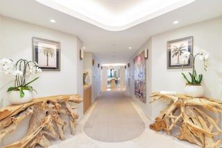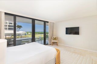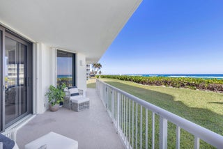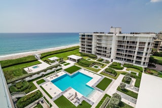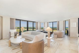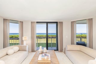 Located directly on the ocean in the prestigious Enclave building on South Ocean Boulevard in Palm Beach, this beautifully designed residence was created by renowned interior designer Noa Santos. The three bedroom, three bath condominium offers 3,577 total square feet of sophisticated living space with exceptional craftsmanship and high-end finishes throughout. The expansive open living and dining areas are designed for both comfort and elegance, with floor-to-ceiling glass doors that fill the space with natural light and frame the breathtaking ocean views. A wraparound balcony allows for a seamless indoor-outdoor flow with views of the lush green space extending to the Atlantic Ocean creating a serene setting for relaxing and entertaining. The gourmet kitchen is equipped withtop-of-the-line Miele appliances, including an oven, microwave combo oven, and stovetop, complemented by a Liebherr refrigerator and freezer. A custom coffee bar and a sophisticated wet bar with an ice maker, fridge, and fluted paneling enhance the home's refined entertaining spaces. A grand entryway and a spacious front hall closet add to the home's thoughtful design. The primary suite is a private retreat featuring two walk-in closets, a built-in desk, a linen closet, and a dedicated shoe closet. Wood floors add warmth and elegance, while terrace doors open to stunning ocean vistas. The spa-inspired primary bath includes dual sinks, a walk-in shower, a separate soaking tub, and a private water closet with a toilet and bidet. The guest suite offers a walk-in closet, an en suite bath with a walk-in shower, and private balcony access with ocean views. The third bedroom opens out onto the terrace with stunning views of the water. An additional bath features a custom vanity and a reeded glass shower enclosure. Additional conveniences include a spacious laundry room with a sink, hanging space, and ample storage, as well as a large front hall closet. Full hurricane doors ensure security and peace of mind, while a Trane A/C system and a water purification system add to the home's modern comforts. The Enclave offers resort-style amenities, including a pool, hot tub, grilling area, tennis court, a state-of-the-art fitness center, and a beautifully appointed party room with a bar and card area. The building also offers a 24-hour doorman and security, a full-time on-site manager, and a gated entrance. Additional features include two garage parking spaces, bike storage, and a private air-conditioned storage unit.