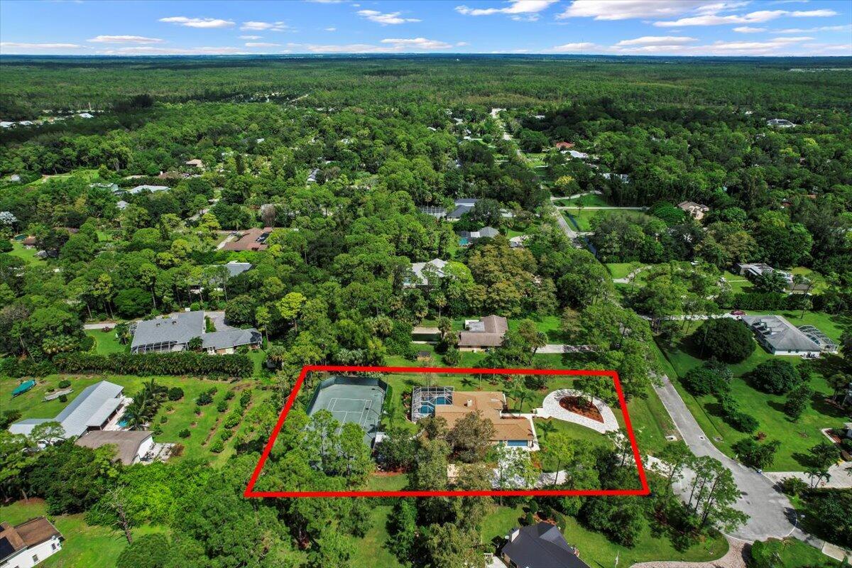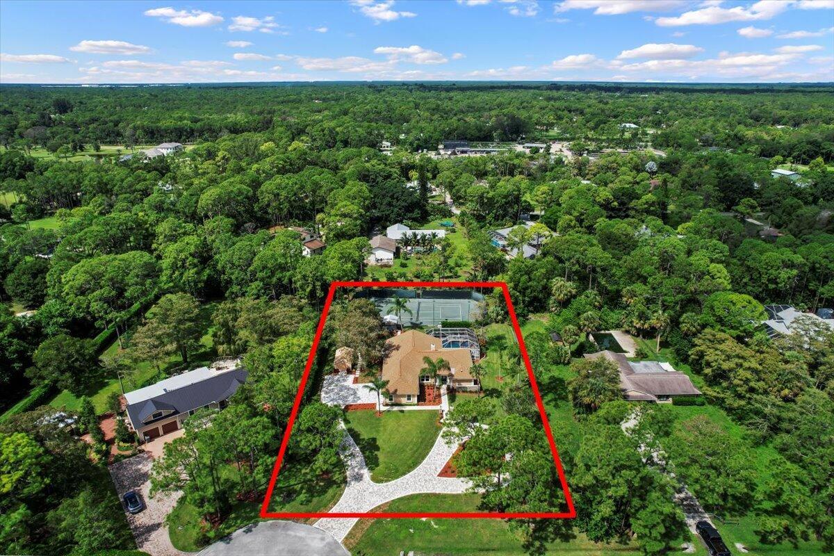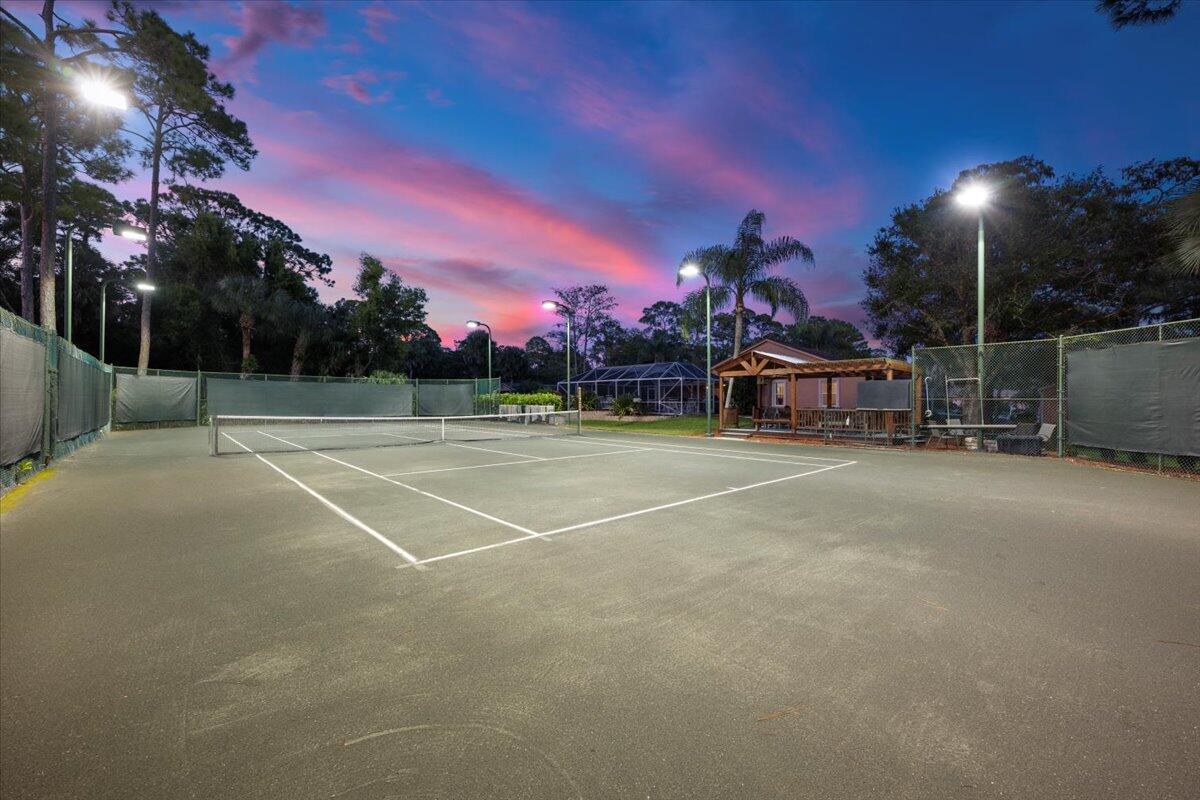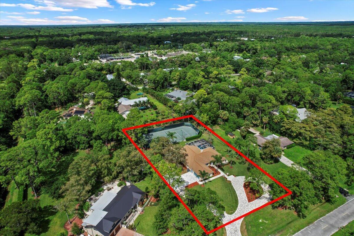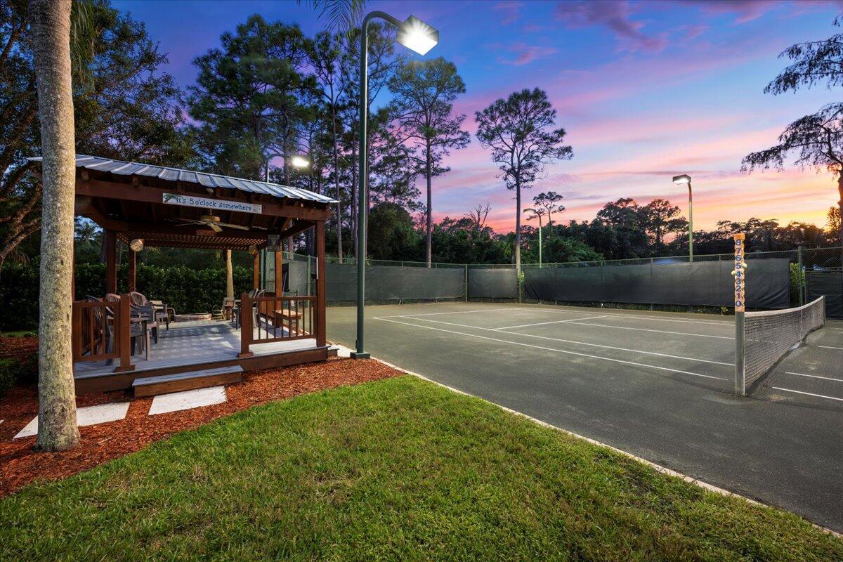 Private Tennis Court! Is tennis your dream? Then this is your dream come true--the ball is in your court! Set at the end of a quiet, paved cul-de-sac is a beautifully landscaped 1.04 acre lot with landscape lighting and a cobblestone driveway. This distinctive 3-bedroom plus den, 3-bath residence is a private paradise for tennis lovers and outdoor enthusiasts. Play every day on your private, regulation-size, Har-Tru (clay) tennis court with eight professional 1,000-watt metal-halide lights (newer ballasts and bulbs) for evening matches and a 10-foot fence on 3 sides for optimal play. An automatic above-ground sprinkler, fed by well water, keeps the court in peak condition. Between sets, relax in the stunning 10' x 20' cedar gazebo with Trex flooring, ceiling fan, power, lightingand a fire pit! An entertainer's dream. Enjoy a free-form screened, saltwater & heated pool with a rock waterfall, sun shelf with 2 Ledge Loungers and hot tub with new heater. The french patterned travertine patio floor features a faux pecky cypress ceiling in the covered area of the patio, a propane fireplace, an outdoor kitchen with built-in grill with custom cement counters and a 100-lb propane tank. The edge detail on the patio counter tops matches the coping of the pool. Patio speakers are installed for you to hook up. A robotic solar skimmer makes for low-maintenance pool care. Enter through impact double doors with privacy glass to a welcoming foyer and living room with a wood-burning fireplace, wood floors and vaulted ceilings. The split floor plan includes a separate dining room, a family room with electric fireplace & TV on an accent wall, a renovated kitchen with granite countertops, 2023 Samsung stainless-steel appliances, an induction cook top and an eat-in dinette area. The master bedroom suite offers direct patio access, custom closet, dual-sink vanity, heated towel bars, and a luxurious shower with a custom linen cabinet. The den is tucked away for a quiet office or guest bedroom. Some additional features: Oversized 2-car attached garage plus storage shed, interior laundry room with custom cabinets, landscape irrigation, wood and tile floors throughout, knock down ceilings throughout, impact windows & doors, Smart phone app controls all irrigation and pool equipment. A/C 2020, water heater 2019. This is more than a home, it's a private tennis retreat with every luxury detail in place. Schedule a private showing and see how this exceptional property lets you live - and play - your passion. Close to Jupiter Farms Elementary School, I-95 & Turnpike. Enjoy bike rides to Riverbend Park, Sunsets at Pine Glades Natural Area. Publix is just 1 mile away. Drive East on Indiantown Road to beautiful beaches and restaurants.