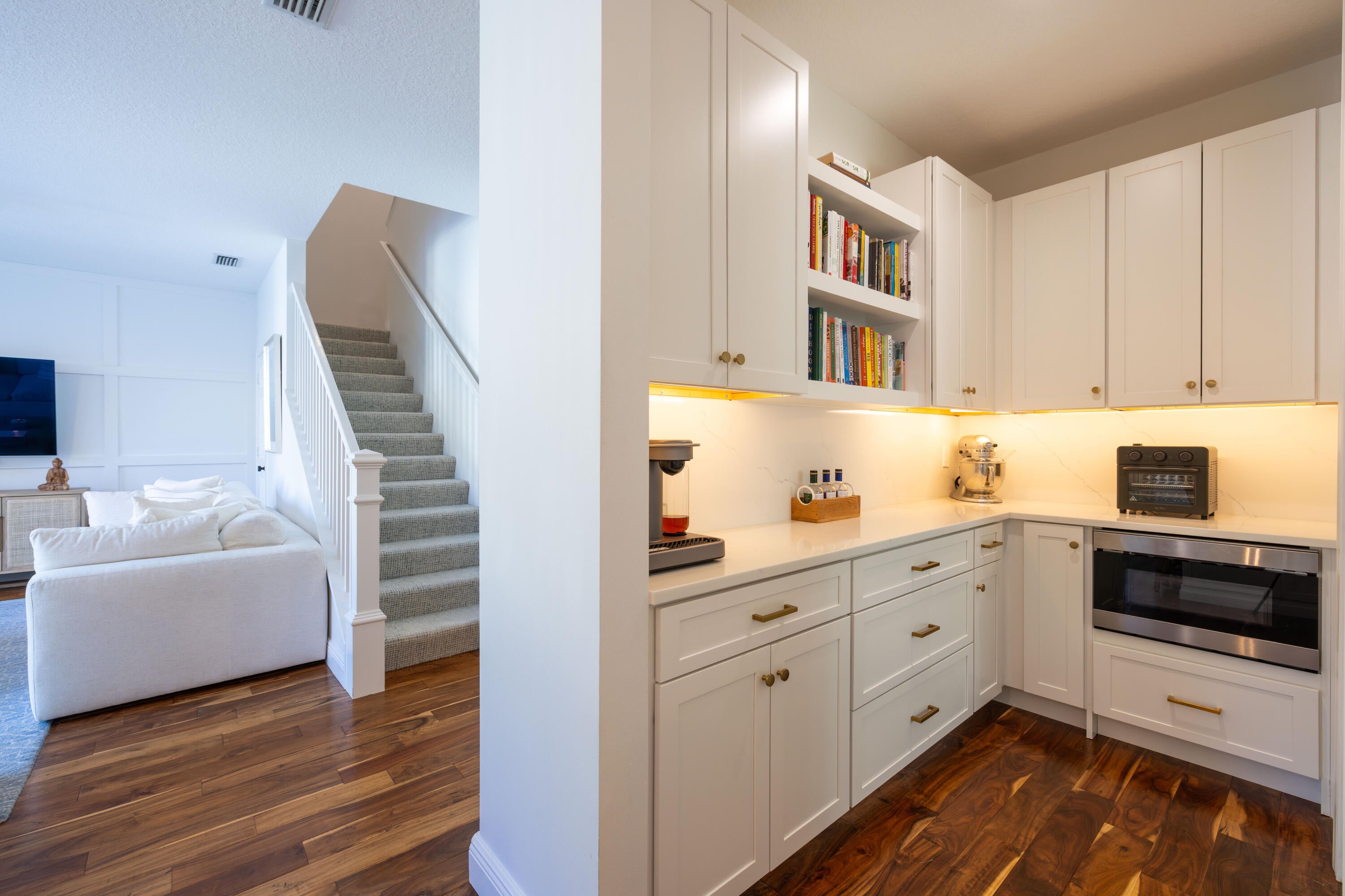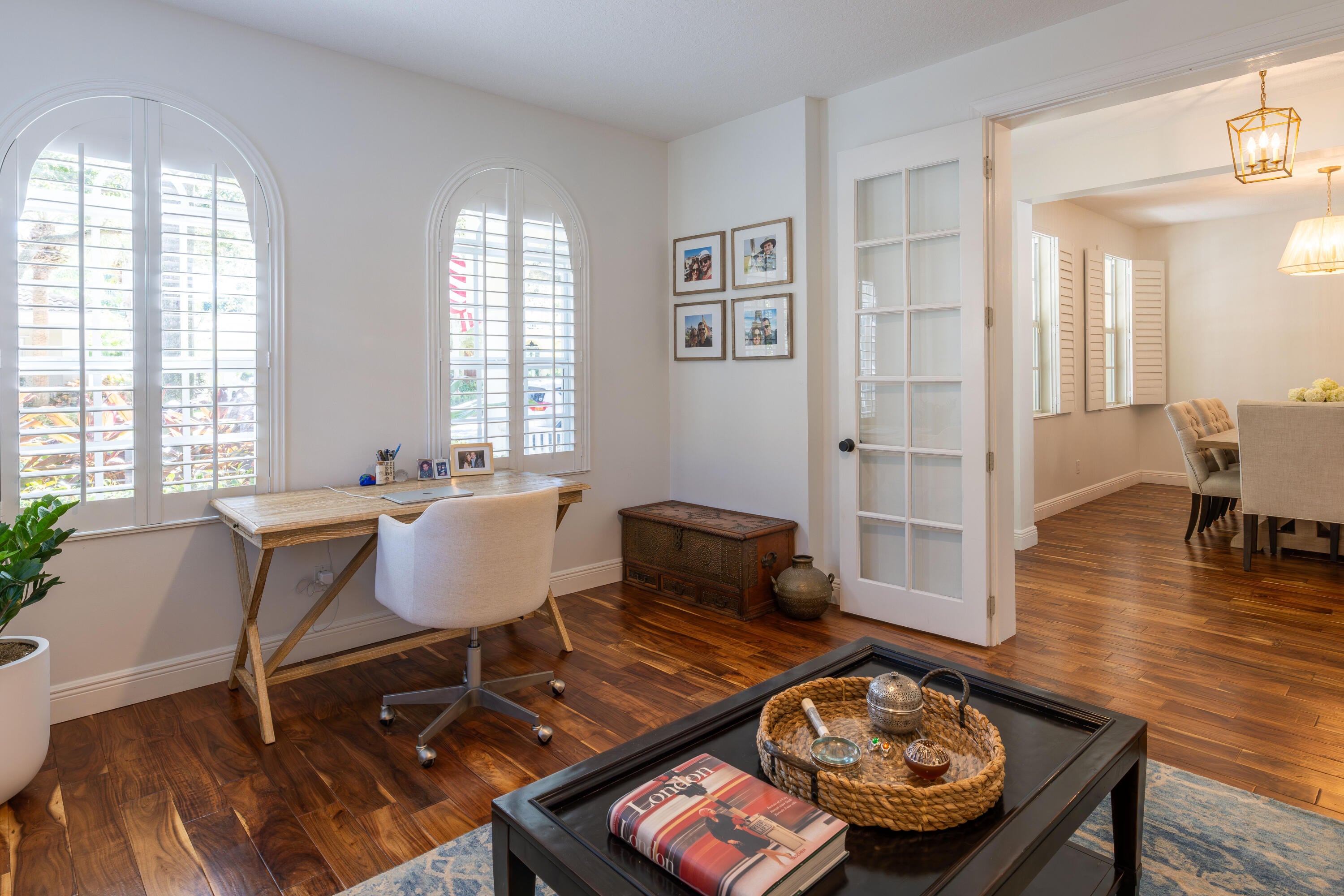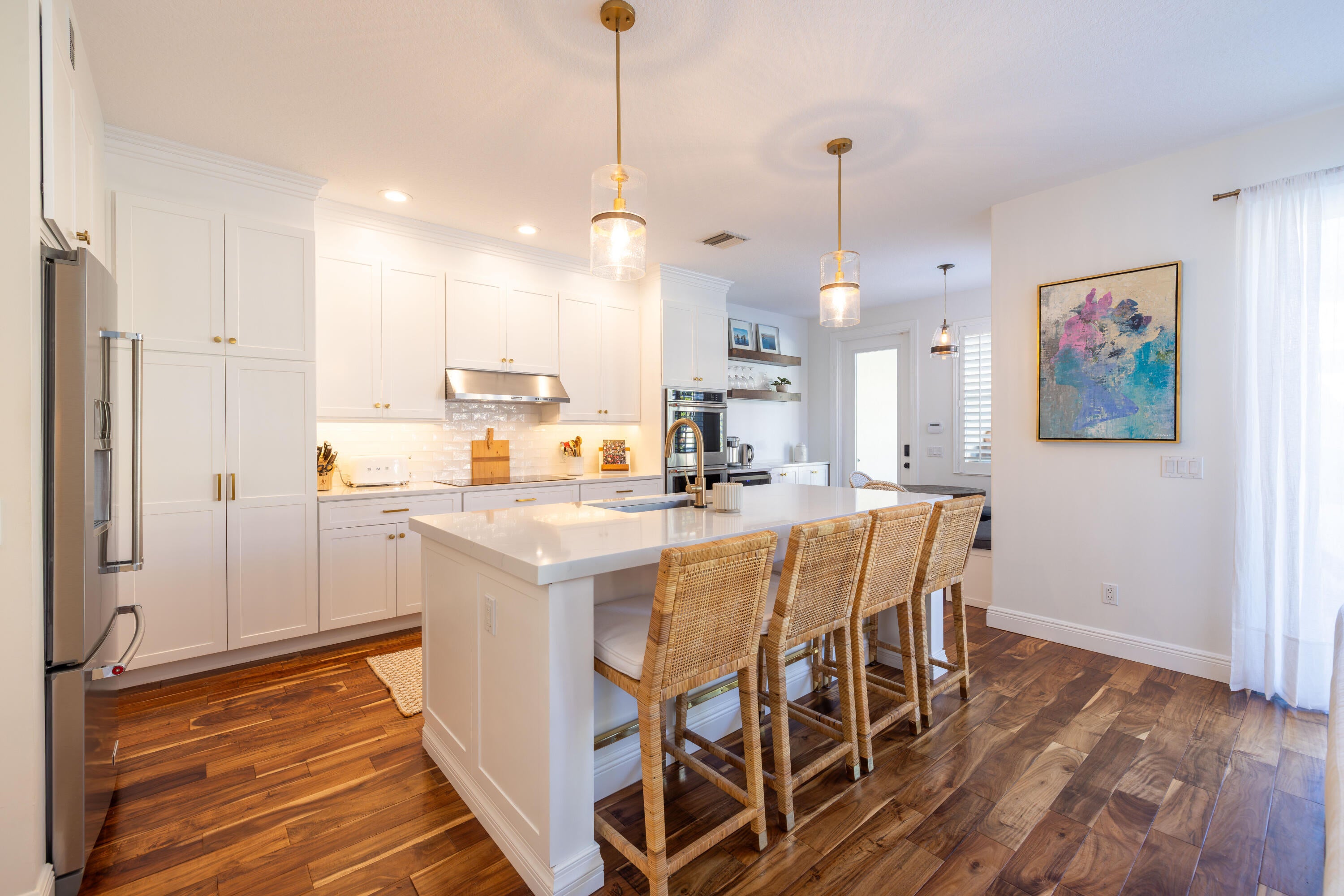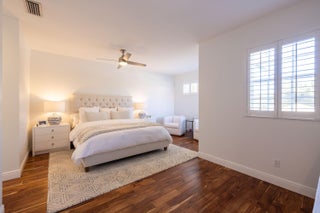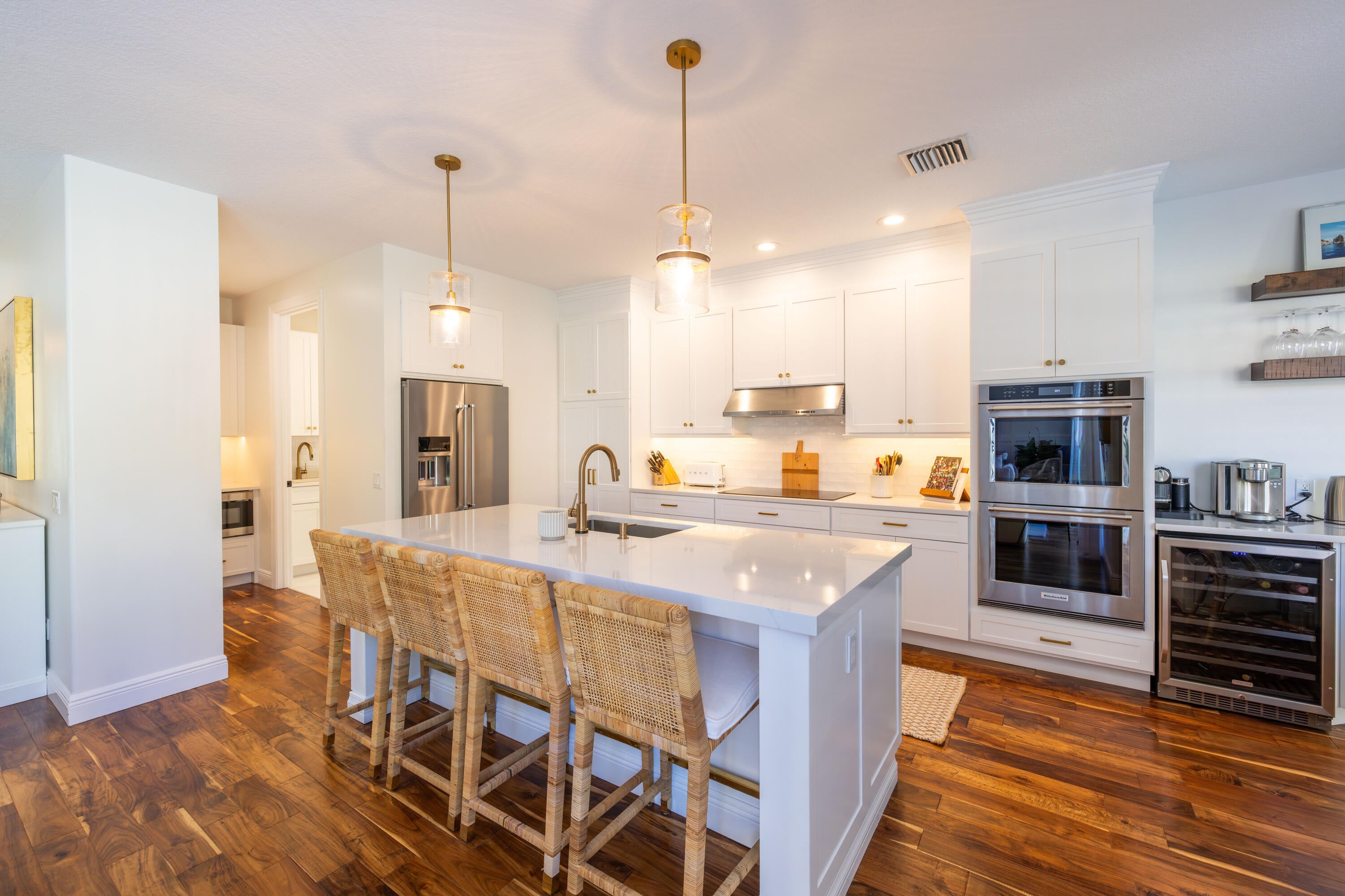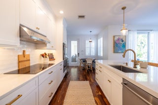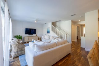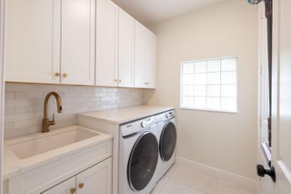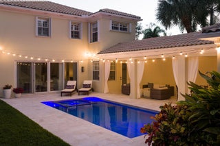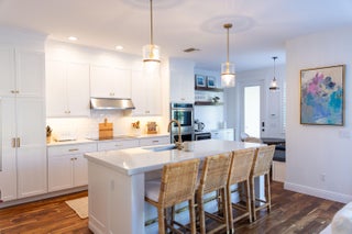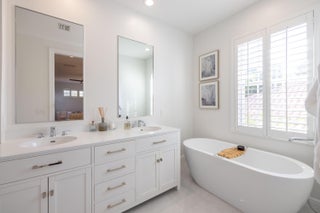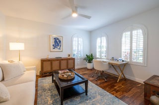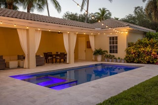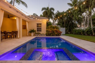 This stunning renovated 4-bedroom, 3-bathroom residence with a dedicated office seamlessly blends sophistication, comfort, and functionality. The chef's kitchen is a true centerpiece, featuring custom wood cabinetry with detailed moldings, under-cabinet lighting, quartz countertops, double oven, microwave drawer, and a distinctive butler's pantry for added storage and style. The primary suite offers a spa-inspired bathroom with large-format porcelain tile, a freestanding soaking tub, a Restoration Hardware vanity, a Toto toilet, and sleek Grohe fixtures. Step outside to your private, fenced oasis; a beautifully designed backyard with a sparkling pool, integrated spa, and elegant leathered travertine decking surrounded by gorgeous tropical landscaping which offers both beauty and privacy.The spacious covered patio with room for a sitting and dining area provides the perfect setting for both entertaining and relaxation. Every detail of this home reflects attention to detail and thoughtful design, resulting in a space that's as functional as it is beautiful.