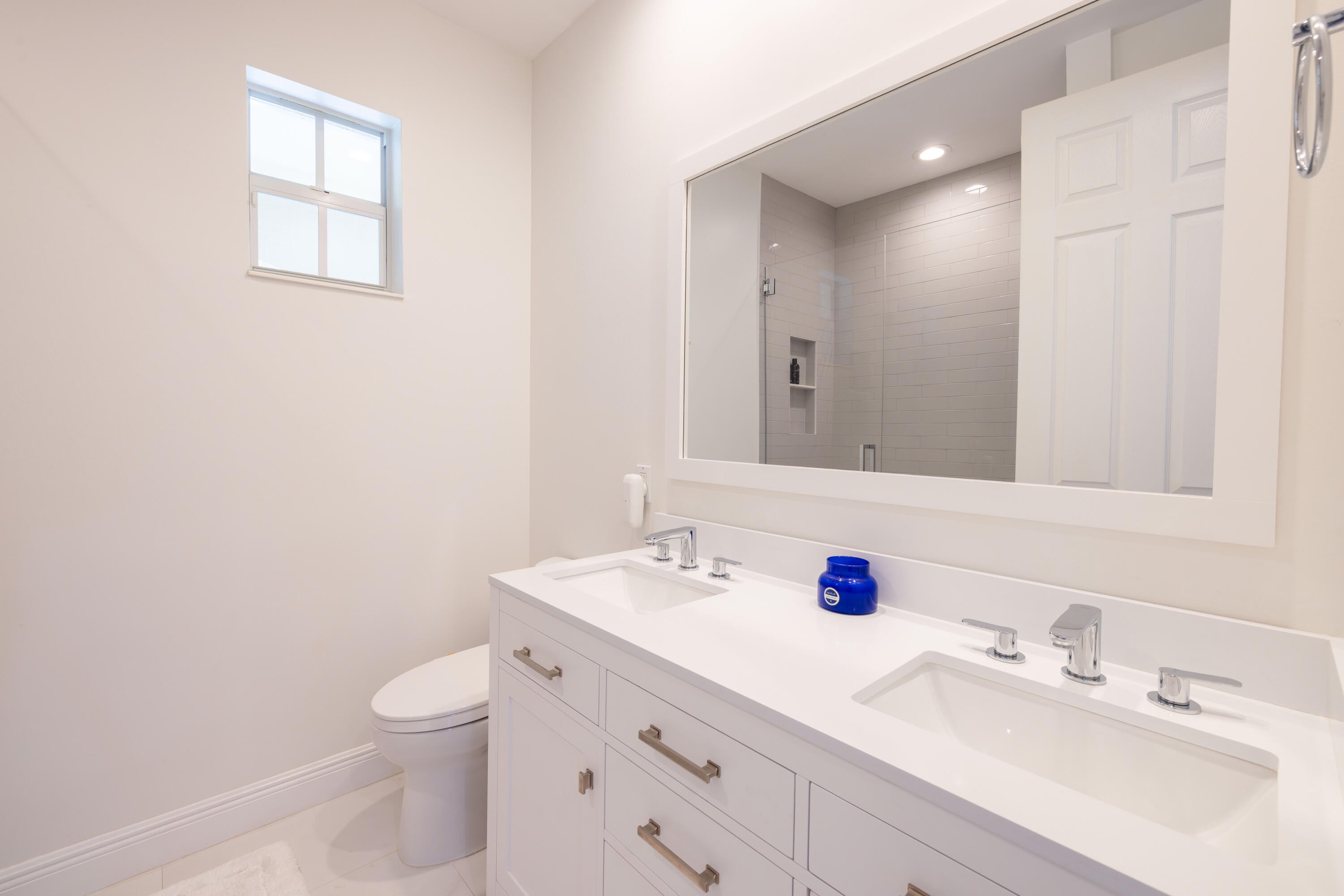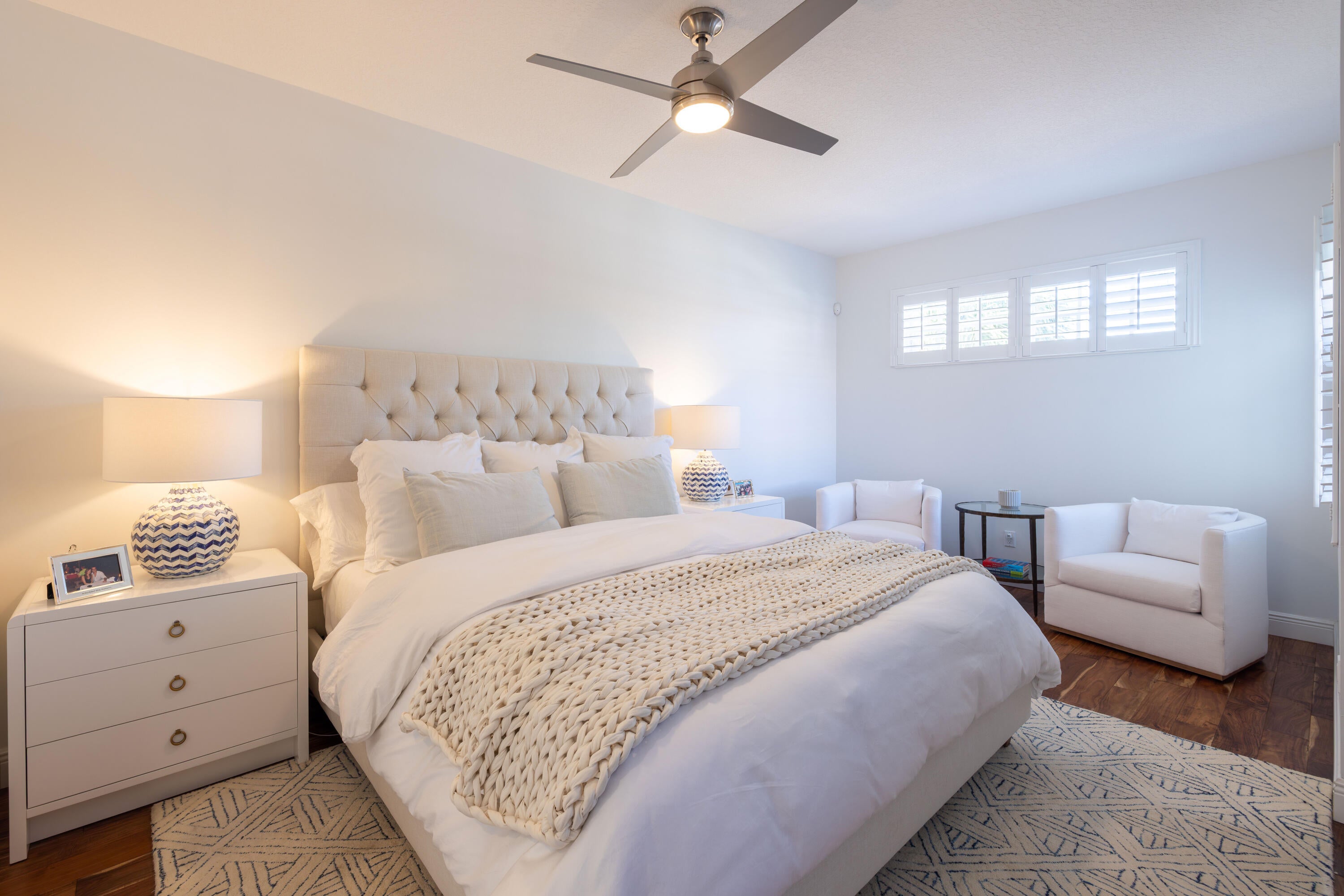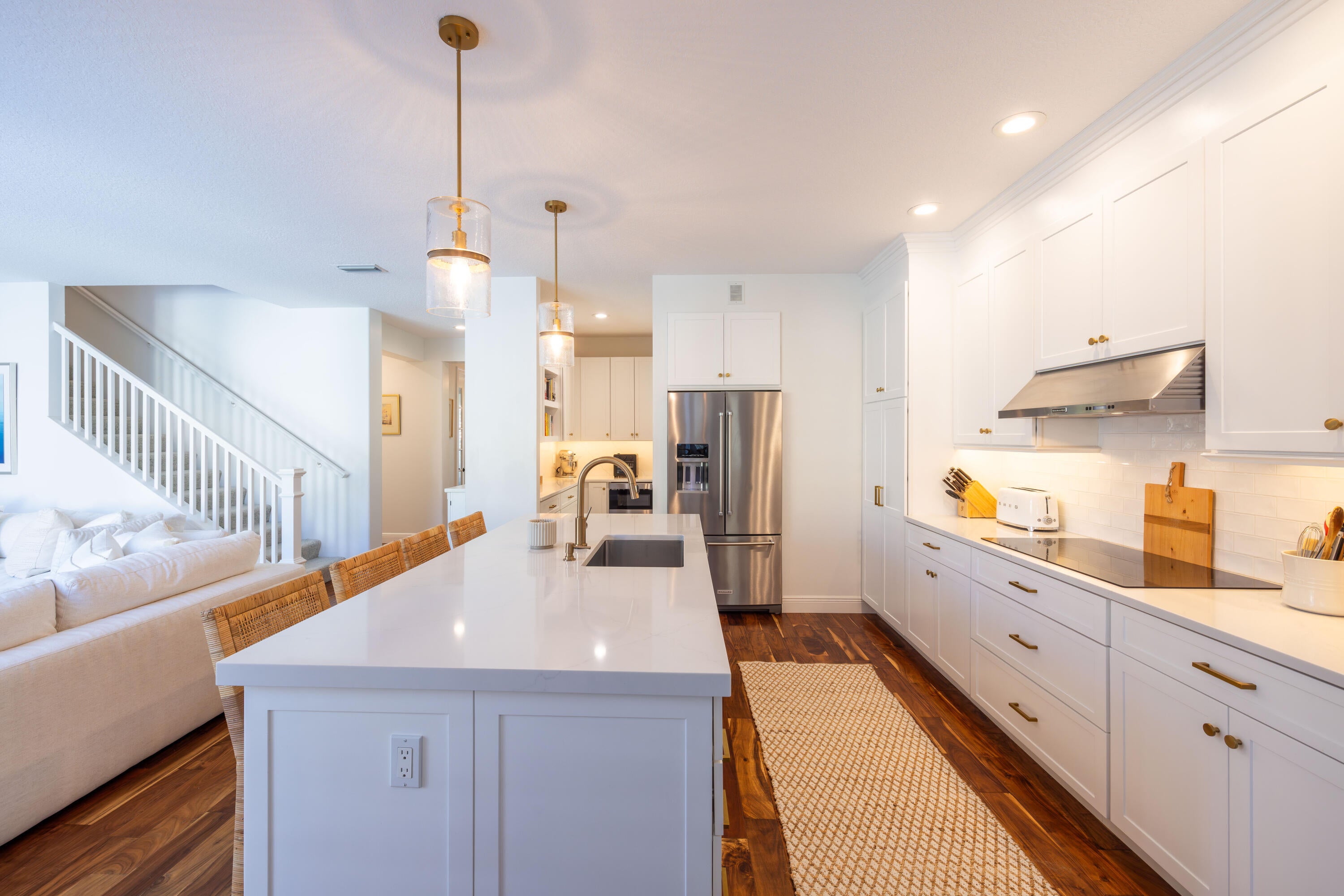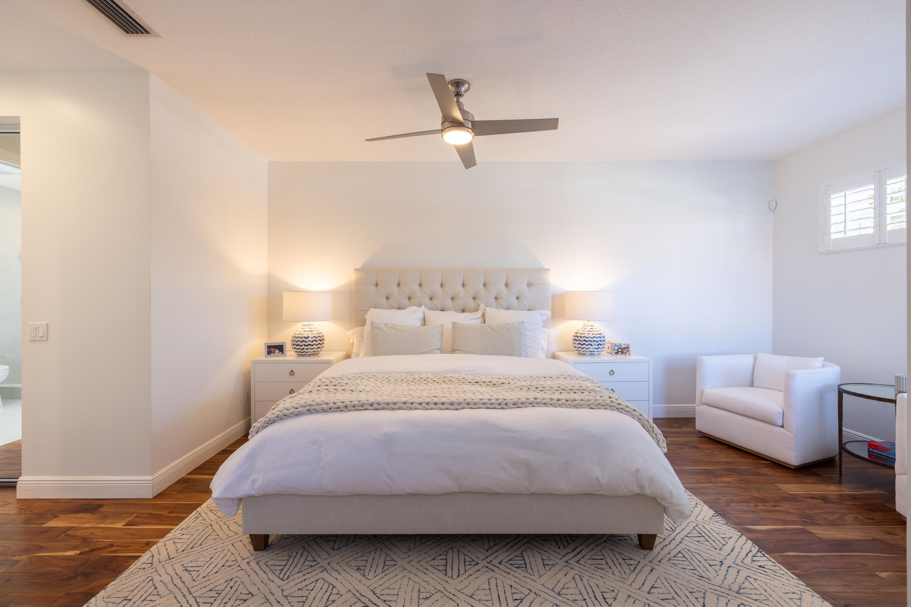 This stunning renovated 4-bedroom, 3-bathroom residence with a dedicated office seamlessly blends sophistication, comfort, and functionality. The chef's kitchen is a true centerpiece, featuring custom wood cabinetry with detailed moldings, under-cabinet lighting, quartz countertops, double oven, microwave drawer, and a distinctive butler's pantry for added storage and style. The primary suite offers a spa-inspired bathroom with large-format porcelain tile, a freestanding soaking tub, a Restoration Hardware vanity, a Toto toilet, and sleek Grohe fixtures. Step outside to your private, fenced oasis; a beautifully designed backyard with a sparkling pool, integrated spa, and elegant leathered travertine decking surrounded by gorgeous tropical landscaping which offers both beauty and privacy.The spacious covered patio with room for a sitting and dining area provides the perfect setting for both entertaining and relaxation. Every detail of this home reflects attention to detail and thoughtful design, resulting in a space that's as functional as it is beautiful.