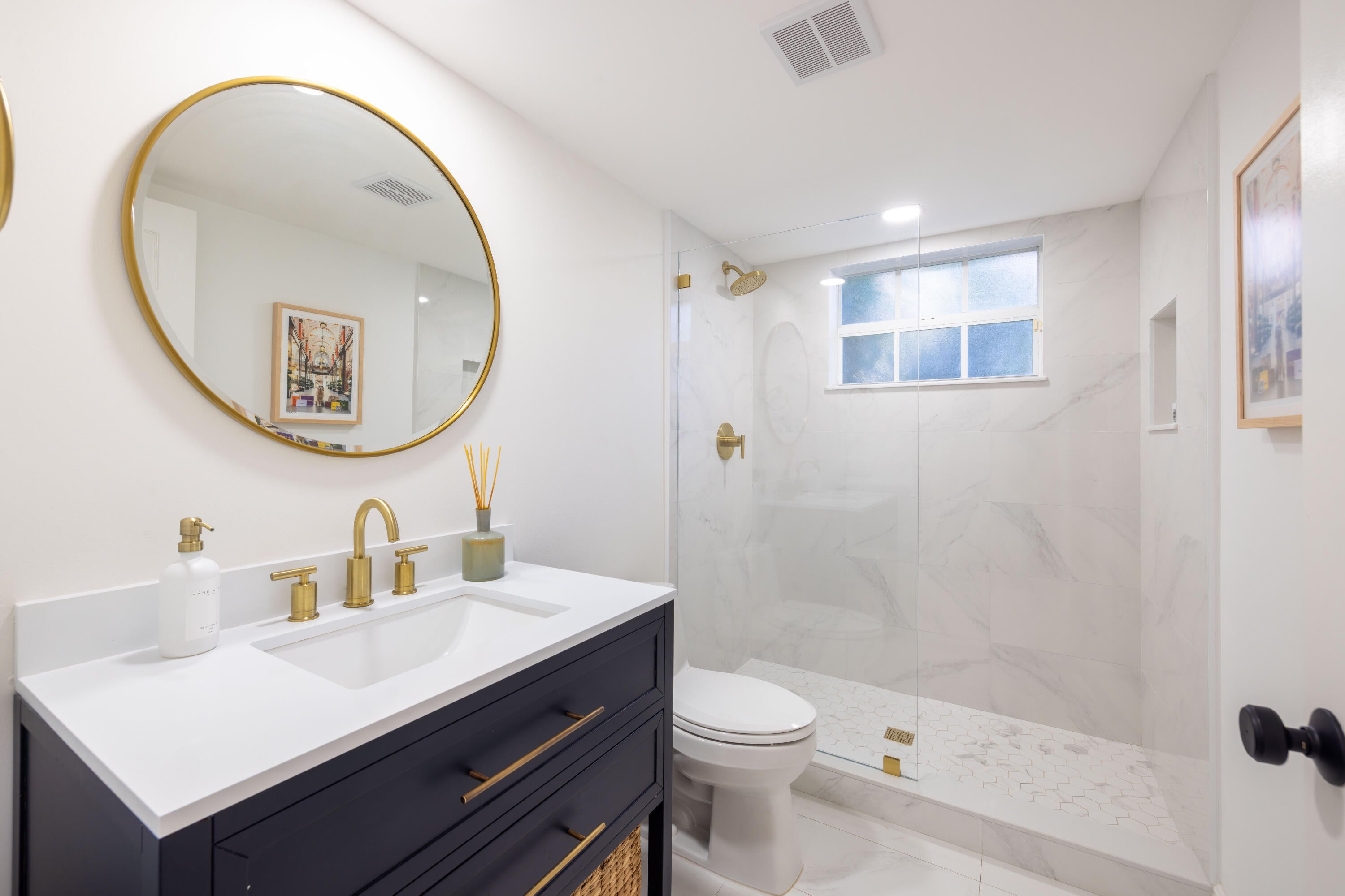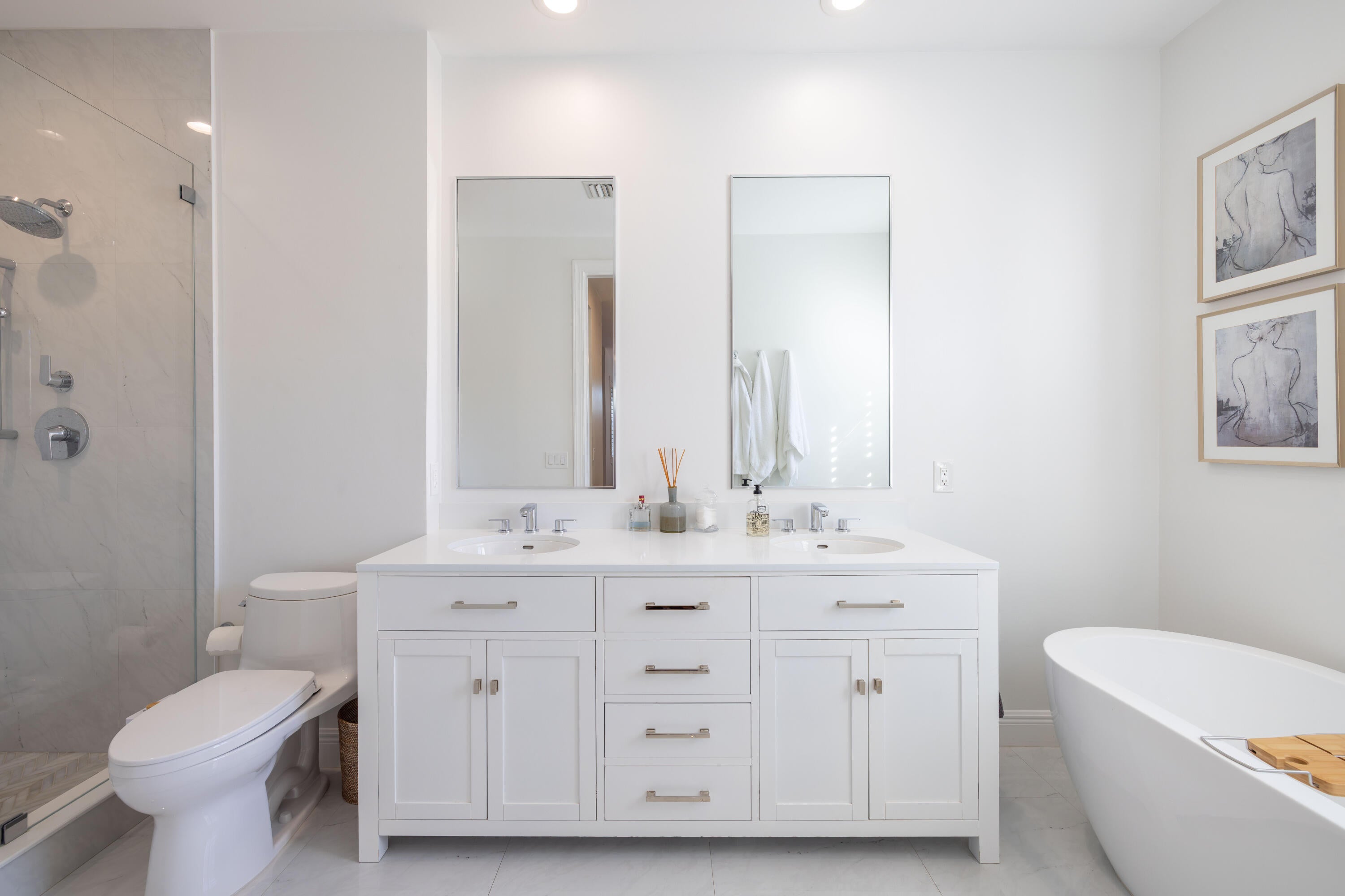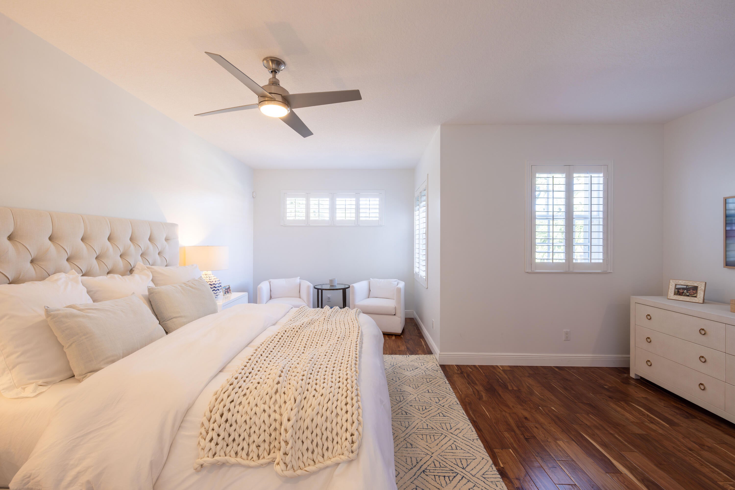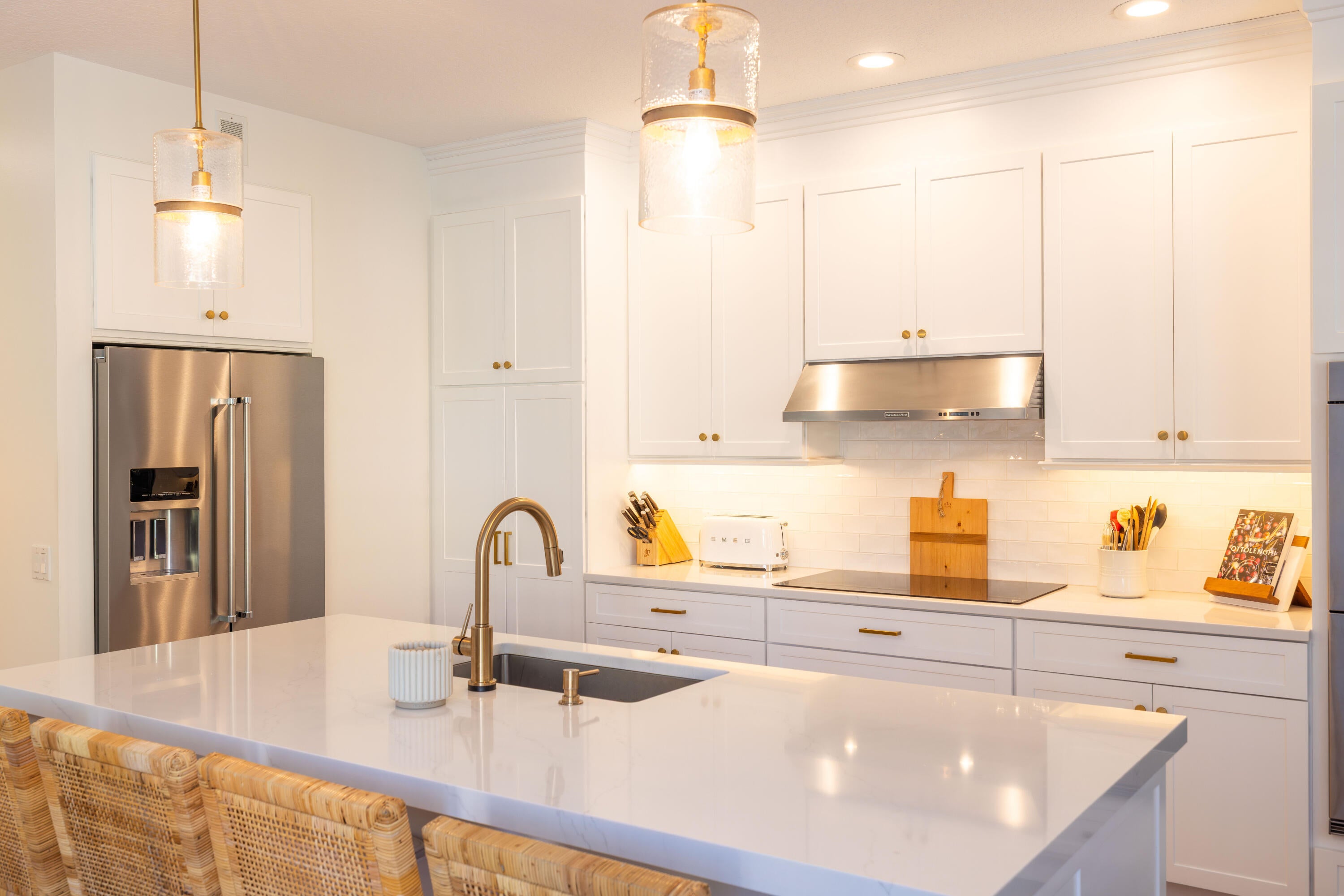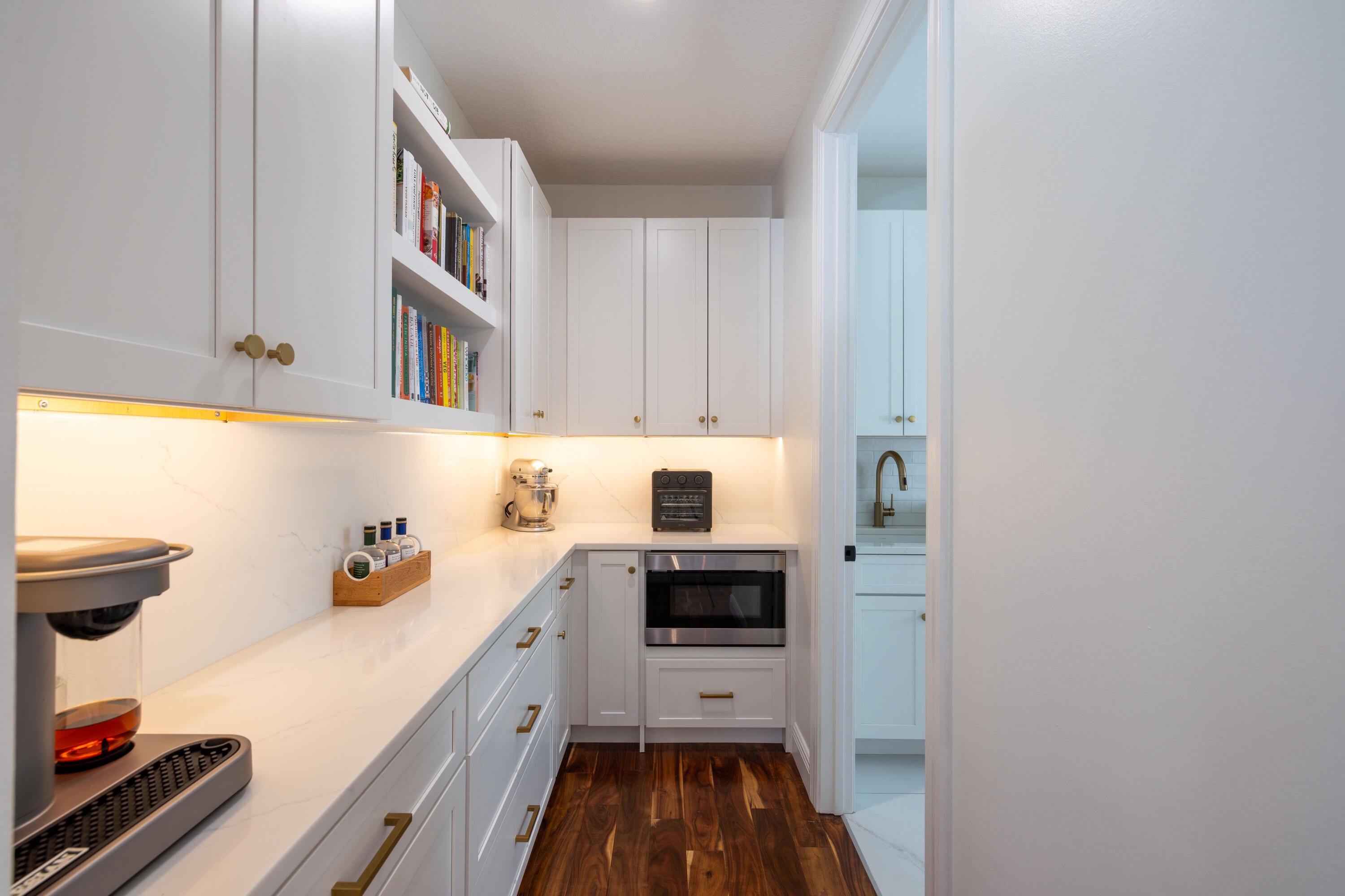 This stunning renovated 4-bedroom, 3-bathroom residence with a dedicated office seamlessly blends sophistication, comfort, and functionality. The chef's kitchen is a true centerpiece, featuring custom wood cabinetry with detailed moldings, under-cabinet lighting, quartz countertops, double oven, microwave drawer, and a distinctive butler's pantry for added storage and style. The primary suite offers a spa-inspired bathroom with large-format porcelain tile, a freestanding soaking tub, a Restoration Hardware vanity, a Toto toilet, and sleek Grohe fixtures. Step outside to your private, fenced oasis; a beautifully designed backyard with a sparkling pool, integrated spa, and elegant leathered travertine decking surrounded by gorgeous tropical landscaping which offers both beauty and privacy.The spacious covered patio with room for a sitting and dining area provides the perfect setting for both entertaining and relaxation. Every detail of this home reflects attention to detail and thoughtful design, resulting in a space that's as functional as it is beautiful.