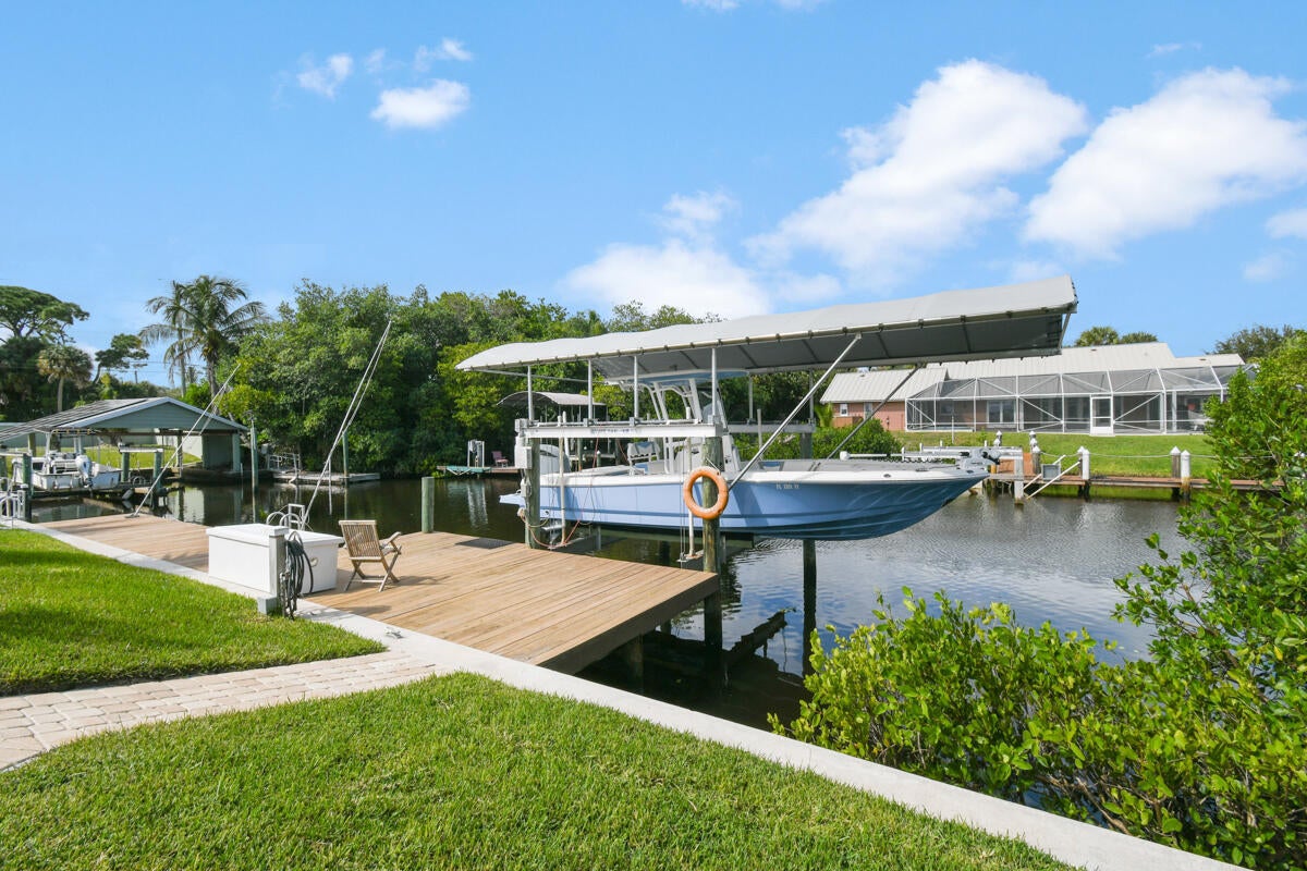 Waterfront Paradise with Dock & No Fixed Bridges! Enjoy the best of coastal living in this beautifully maintained 3-bedroom, 2.5-bath canal-front home just off the Intracoastal Waterway. Boaters will love the 100 ft. seawall, private dock with 16,000 lb lift, boat canopy and no fixed bridges to the ocean. Entertain effortlessly on the expansive patio with built-in grill, relax by the sparkling pool, or unwind under the covered lanai with tranquil water views. Inside, natural light fills the open-concept living and dining areas, complemented by volume ceilings and water-facing sliders that create seamless indoor-outdoor flow. The primary suite offers direct access to the lanai and pool, providing a serene retreat.Additional features include a paver driveway with boat/RV parking, fenced yard, outdoor shower, impact windows and a new roof (2021) for peace of mind. Perfectly located near downtown Hobe Sound, pristine beaches, parks, dining, and shopping, this home combines comfort, convenience, and the true Florida waterfront lifestyle.