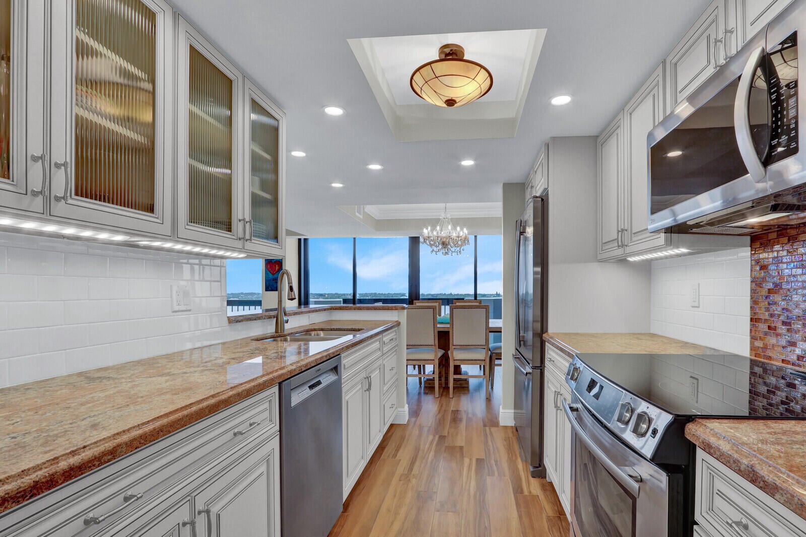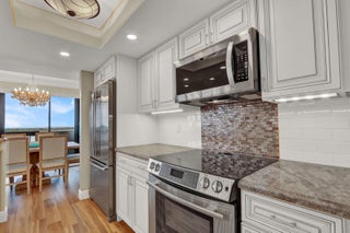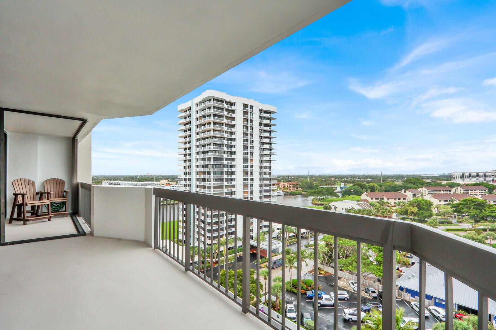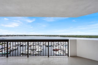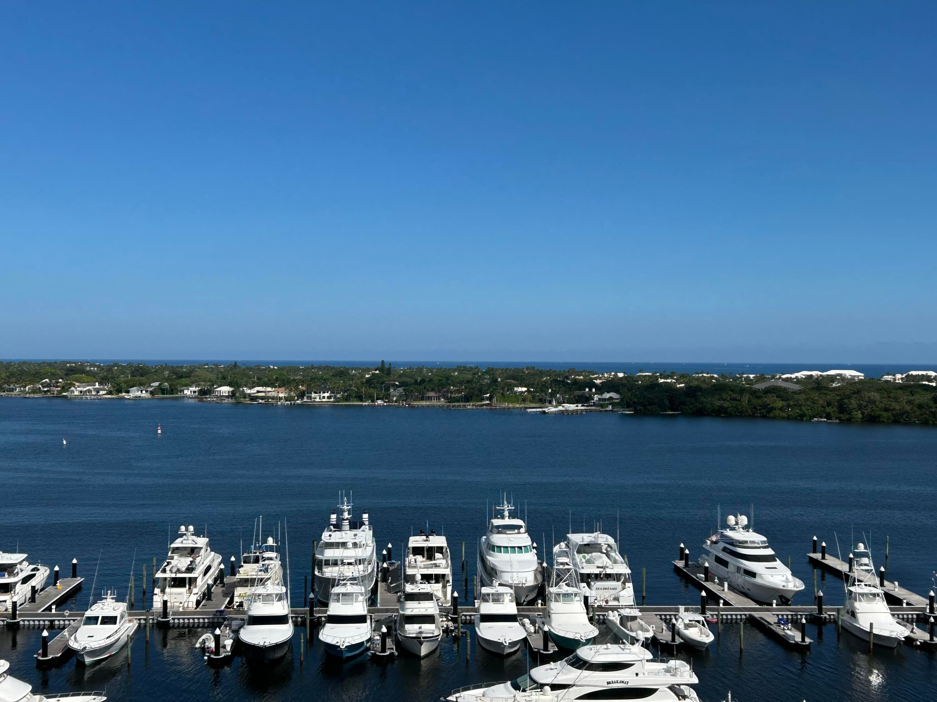 Move right in everything has been done for you! This beautifully renovated 2-bedroom, 2-bathroom luxury condominium on the 12th floor offers an elevated coastal lifestyle with wrap-around deck & breathtaking views from every room, overlooking the Intracoastal Waterway, Singer Island, and the Atlantic Ocean. Enjoy both spectacular sunrises and sunsets. The condo features new HURRICANE IMPACT floor-to-ceiling windows and sliding glass doors, bringing in abundant natural light and showcasing the incredible views. Completely RENOVATED with high-end finishes, porcelain wood-look plank tile flooring, LED high-hat lighting, new doors throughout, freshly painted. New waterproof decking 2025.Both bathrooms have been remodeled with quartz countertops and nickel cabinet hardware. The primary bathroom includes an oversized shower with porcelain Calcutta large-format wall tile, a dual vanity with generous storage, and a linen closet with built-in shelving. The large primary suite also features a huge walk-in closet with custom shelving and organizers, plus a spacious dressing area with a large mirror. The stunning kitchen offers granite countertops, a stylish backsplash, reeded glass upper cabinets, and under-cabinet lighting. High-end JennAir and Bosch kitchen appliances. The former passthrough wall was removed to create an open layout that maximizes the expansive views. The dry bar has excellent cabinet storage and matching nickel hardware. Additional interior features include ceiling fans in the living room and primary bedroom, decorator crown molding and baseboards, and a spacious laundry room with cabinetry, a quartz folding shelf, and newer Whirlpool full-size washer and dryer. There is also a coat closet in the foyer and a storage closet located just outside the unit. Mechanical updates include a new AC (2022), new hot water heater (2024), an upgraded electrical panel, new lighting with dimmers, and all new California-style closets and cabinetry throughout. Enjoy the views from the expansive wrap-around balcony, and appreciate the newer window treatments already in place. New waterproof decking 2025. Community amenities include a 24-hour manned gatehouse, pool, hot tub, summer BBQ area, multiple lounge areas, and community room with kitchen perfect for entertaining. Residents also enjoy a 2-mile waterfront walking path around the complex and the adjacent, independently operated Safe Harbor Marina with dock rentals, fuel services, and direct ocean access. All-ages building. Small pet allowed.