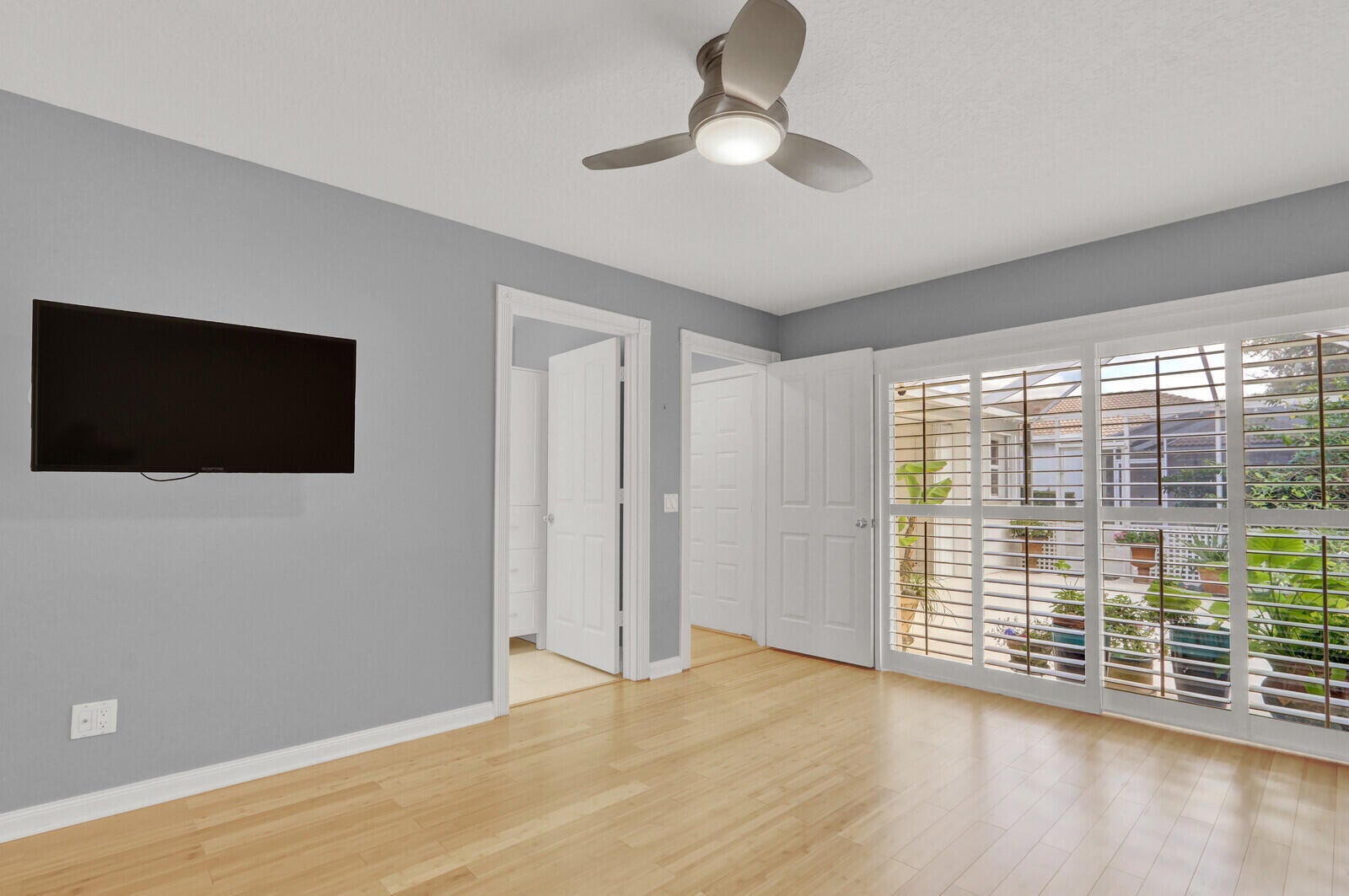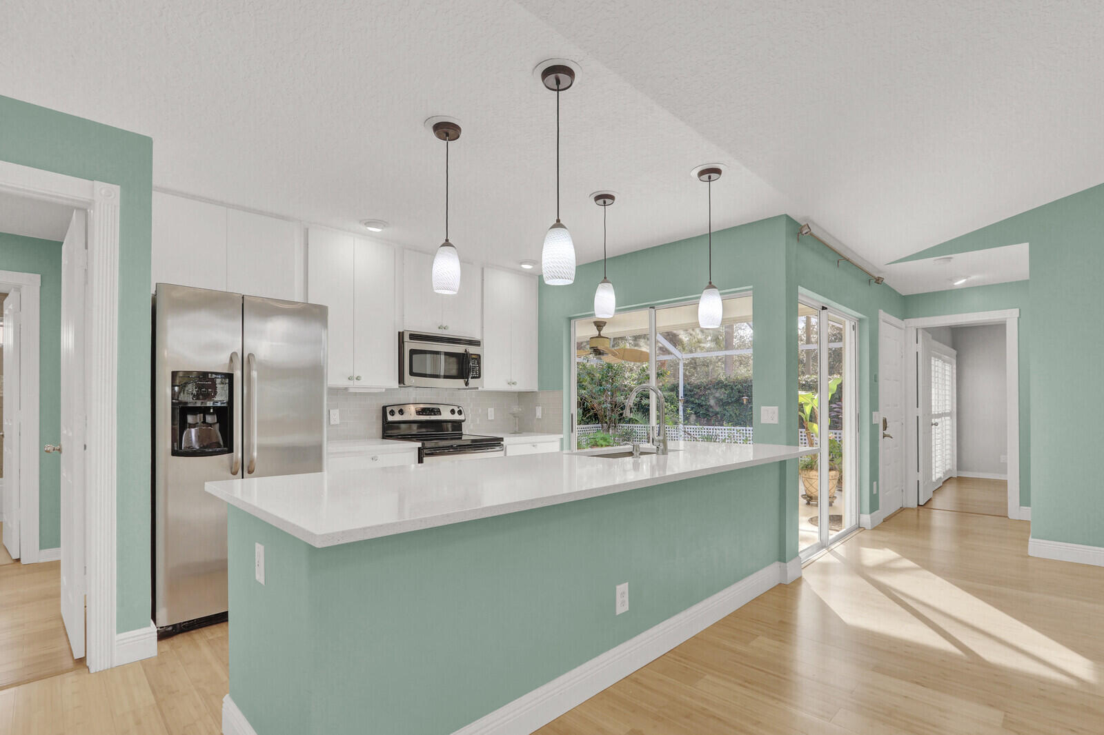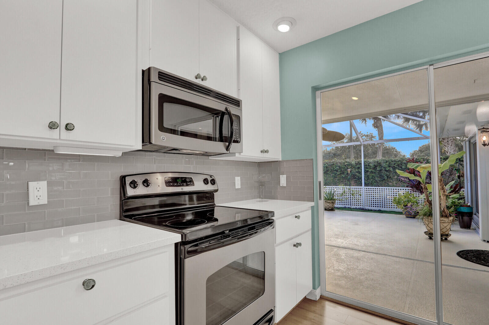 Wonderfully updated Sun Terrace 2-bedroom, 2-bath home located in the heart of PGA. This light and bright residence features a beautifully renovated kitchen with quartz countertops, bamboo flooring throughout and a sleek white entertainment built-in. The primary bath has been tastefully updated with a new vanity and a glass-enclosed shower. Enjoy Florida living at its best with a huge screened enclosure offering a quiet and private rear location--perfect for relaxing or entertaining. Sun Terrace offers a community pool and picturesque tree-lined walkways, all just minutes from shopping, dining, golf, and the best of Palm Beach Gardens.