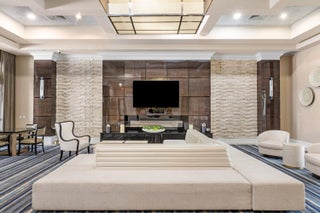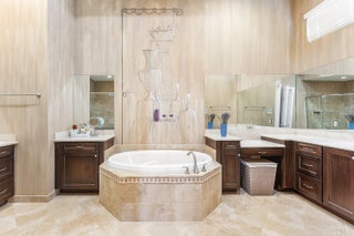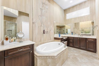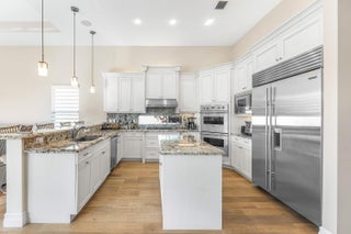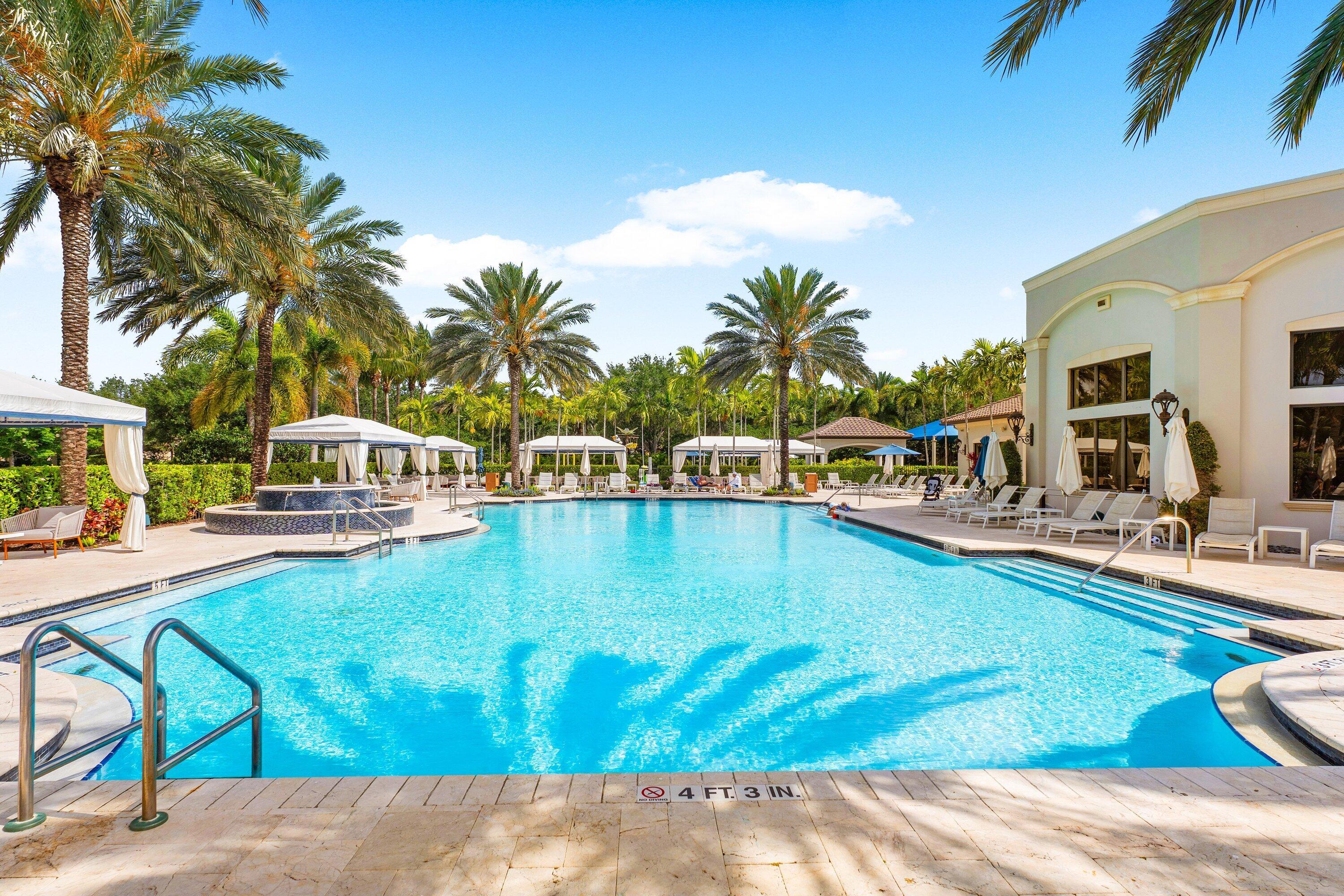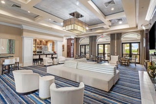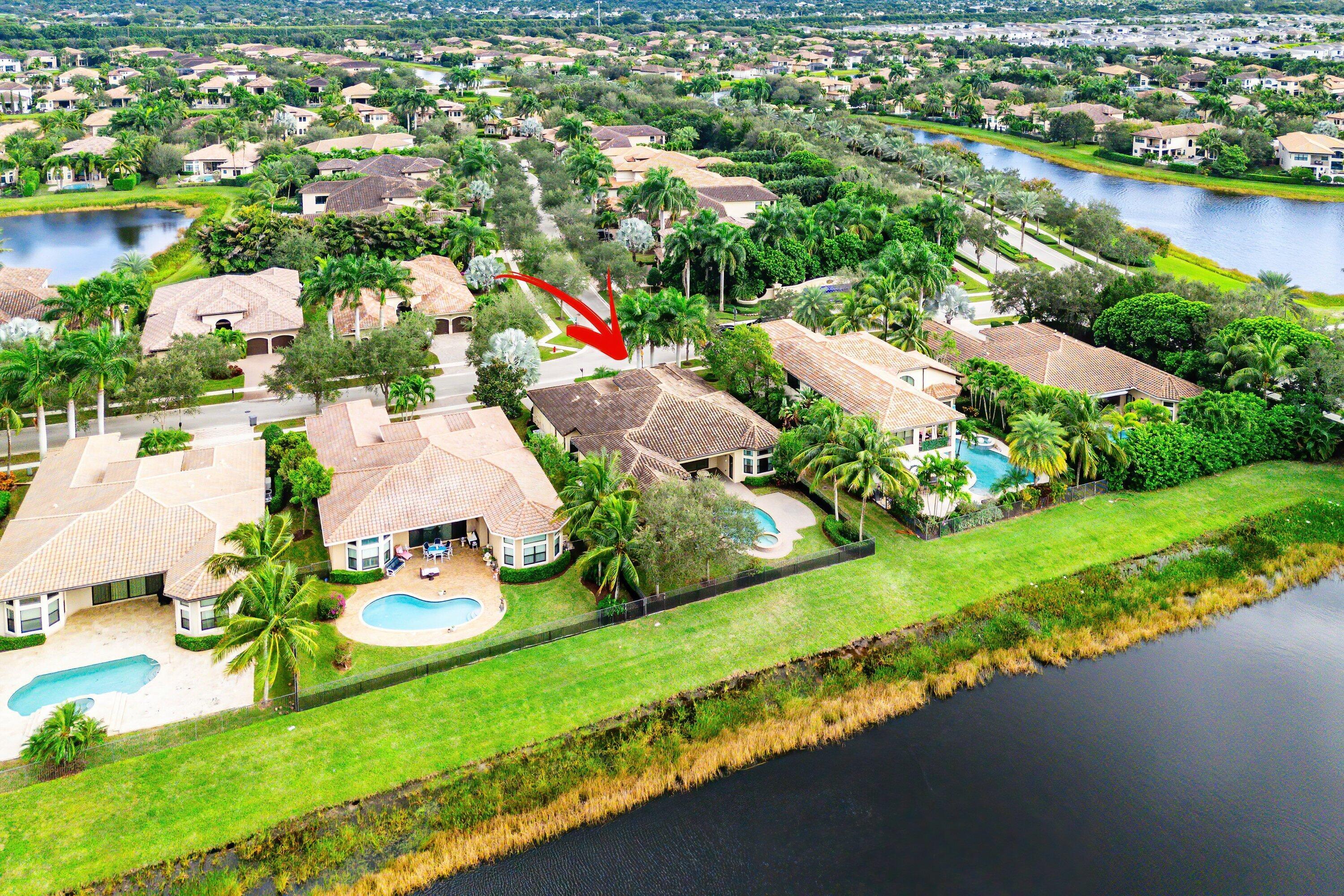 Experience elevated lakefront living in this exceptional single-story Venetian Model from the Coastal Collection, located in the prestigious gated community of The Bridges. This expanded residence welcomes you with a dramatic double-height foyer leading to a stately living room, formal dining room, and spacious family room. Marble flooring, volume coffered ceilings, and a custom wet bar create a refined and inviting atmosphere.Expansive windows showcase breathtaking lake and pool views, seamlessly blending indoor elegance with outdoor tranquility. The heated saltwater pool and spa are surrounded by lush landscaping and capture stunning sunset vistas across the approximate 1/3-acre lot.Offering 3,745 sq ft of luxury living, the home features 3 bedrooms, 3.5 baths, a large club room, and a private gym (optional 4th bedroom). The gourmet kitchen includes granite countertops, Sub-Zero & Viking appliances, and a walk-in pantry. The private primary suite serves as a serene retreat with dual custom walk-in closets and a spa-inspired bath with dual vanities, soaking tub, and frameless glass shower. The split-bedroom layout provides privacy for all guests. Additional upgrades include custom window treatments, designer lighting, whole-house generator, impact windows/doors, surround sound and a electric charger in the garage. Residents of The Bridges enjoy resort-style amenities: clubhouse with restaurant & lounge, fitness center, tennis/Pickleball, indoor/outdoor basketball, resort pool & spa, yoga studio, sauna, splash pad, playground, and manned gated security.