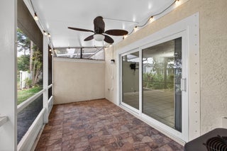 Minutes to the ocean in a gated Jupiter community. Impact Glass Throughout. Discover this impeccably maintained 2-bedroom, 2.5-bath home located in one of Jupiter's most desirable boutique gated communities, just minutes from pristine beaches. A custom stained-glass entry door welcomes you with natural light that flows through the open-concept layout to impact-rated sliding doors and a covered screened-in patio ideal for indoor-outdoor living.This home features impact windows throughout, newer appliances, a newer roof, spacious closets, and rare overhead garage storage. Wall-mounted TV setups in both the living room and primary bedroom add modern convenience. Zoned for top-rated Jupiter schools, this residence offers comfort, convenience, security, and effortless coastal living.