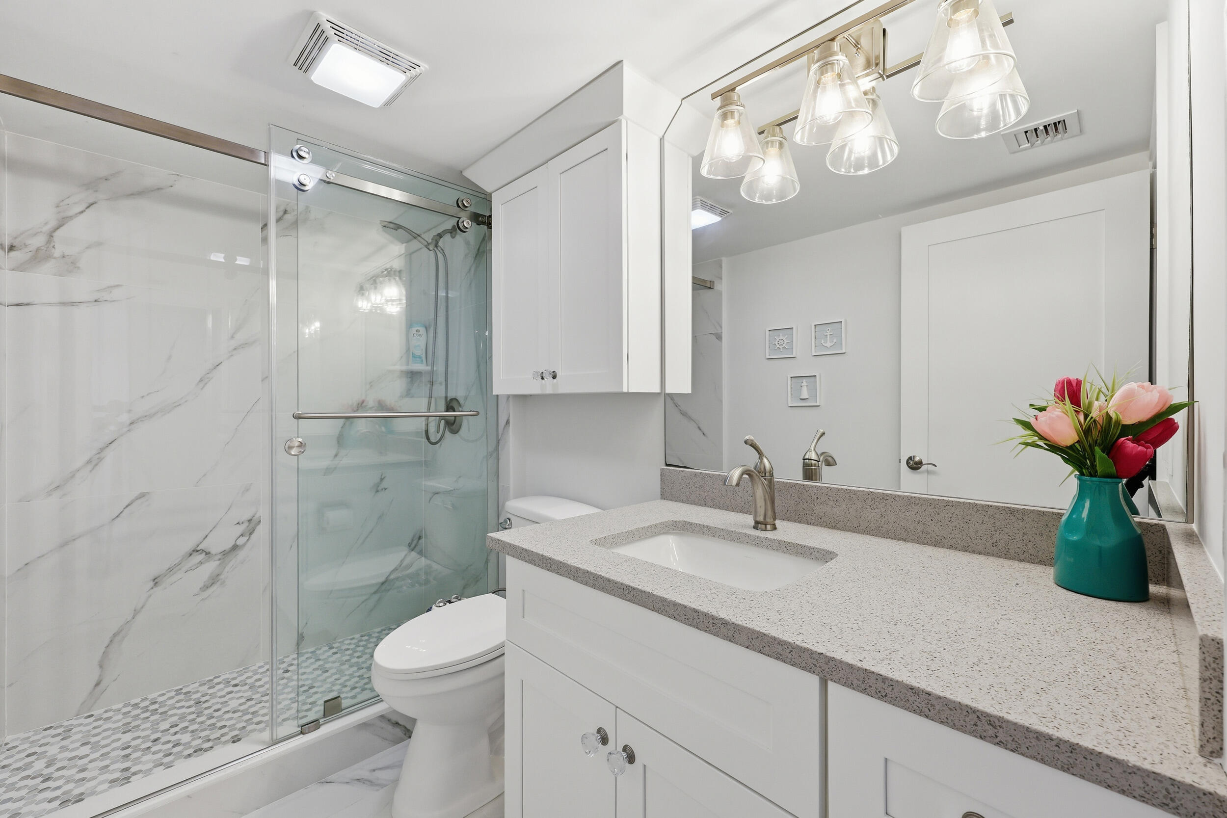 No detail was overlooked in this fully renovated 2-bedroom, 2-bath oceanfront condo in Jupiter, where quality craftsmanship meets breathtaking coastal views. This residence has been thoughtfully reimagined from top to bottom, with every surface, system, and finish carefully selected to deliver a truly turnkey experience.The stunning kitchen has been completely redesigned with white shaker cabinetry, quartz countertops extended by 30 inches for enhanced function and seating, and a seamless open layout ideal for entertaining. Large scale porcelain tile and flows throughout, while all baseboards, casing, and crown molding have been fully replaced, reinforcing the home's elevated, finished feel.Both bathrooms echo the kitchen's high-end design with white shakercabinets, quartz counters, and spa-inspired finishes, creating a cohesive and timeless aesthetic. A redesigned laundry room adds exceptional functionality, featuring an ice maker and an additional bonus room off the laundry perfect for storage, office space, or flexible use. Enjoy peace of mind and storm protection with full impact windows, all while taking in spectacular ocean, lake and pool views. Major systems have been addressed as well, including a new HVAC system and hot water heater (2021).