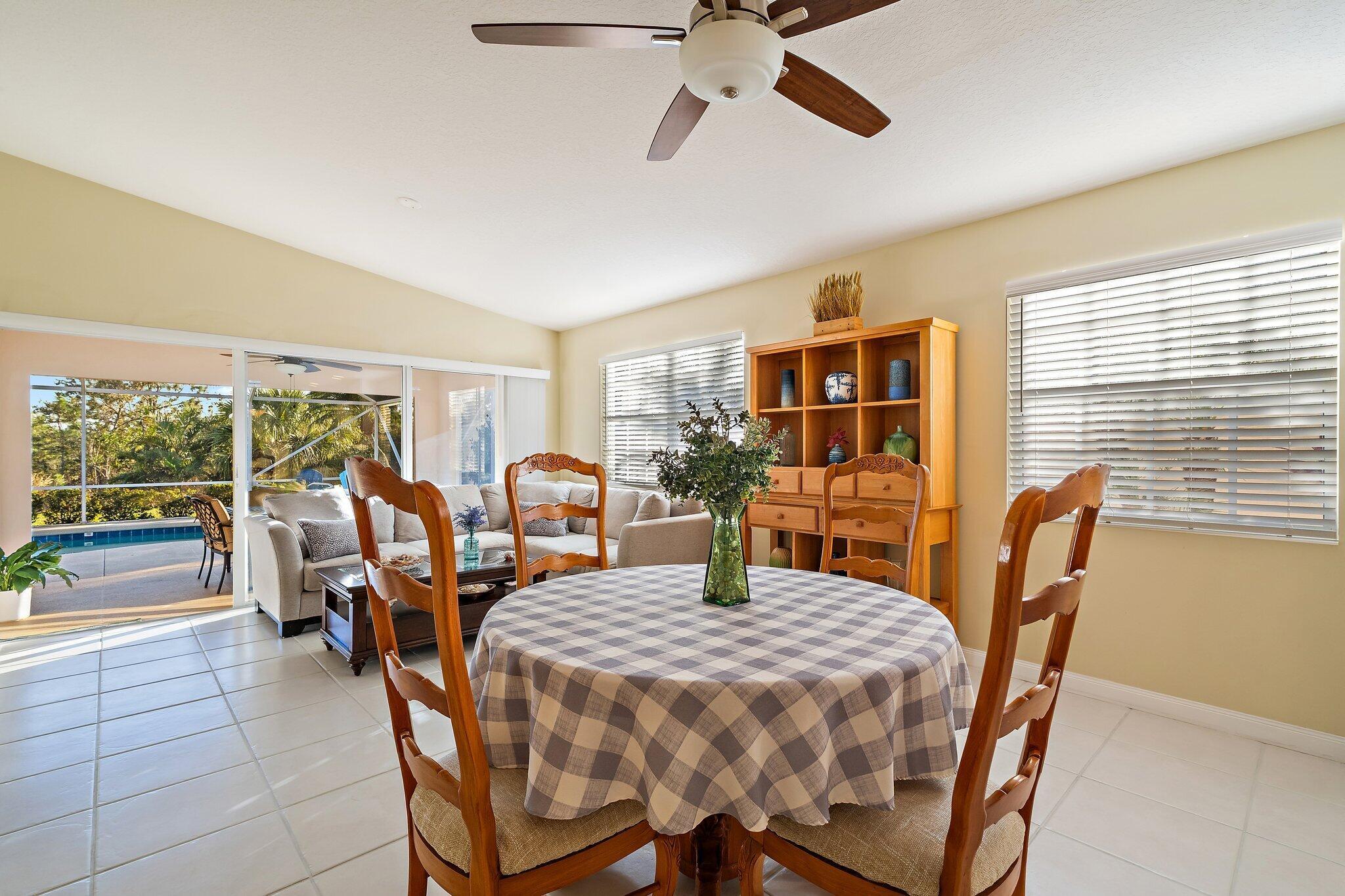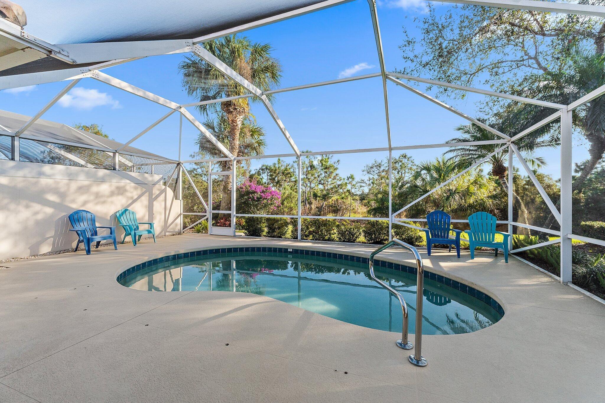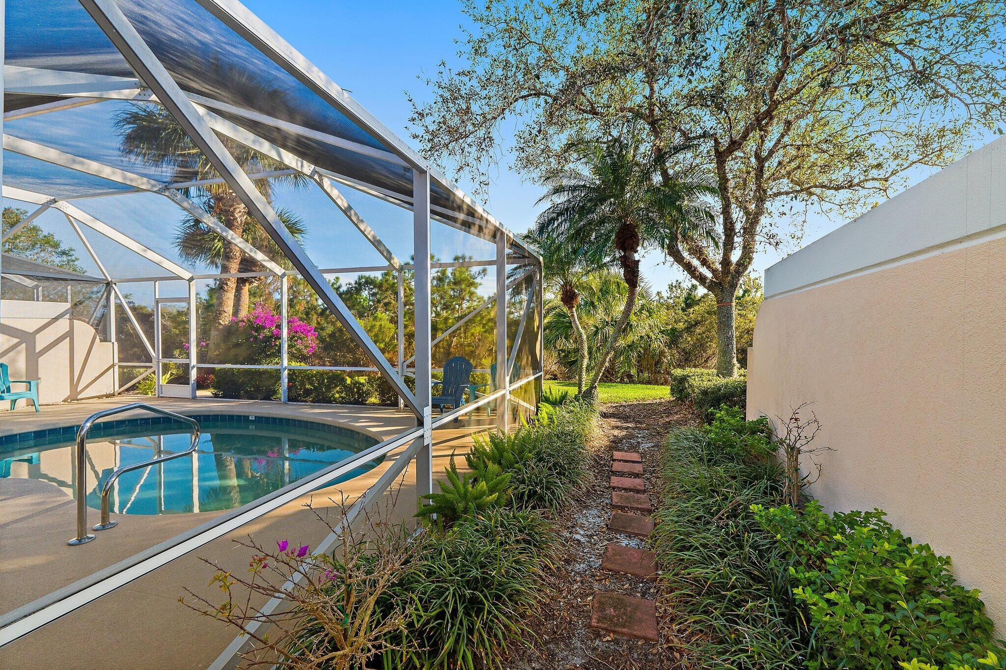 Overlooking a peaceful nature preserve, this 2-bedroom, 2-bath CBS villa in The Retreat at Seabranch offers a private screened pool, low-maintenance living, and a layout designed for comfort.The single-story floor plan features over 1,500 sq ft with a true split-bedroom design, tile and laminate flooring throughout, and a spacious great room that flows to the outdoor patio. The primary suite includes dual vanities, and partial impact windows pair with full panel shutters for added storm protection.Out back, a screened-in pool provides a quiet retreat surrounded by tropical landscaping. The 2-car garage adds convenience, and the HOA covers exterior maintenance and lawn care.With access to a clubhouse, tennis, pickleball, fitness center, and more, plus close proximity to Hobe Soundbeaches, Seabranch Preserve, and A-rated schools, this home blends lifestyle, value, and location.