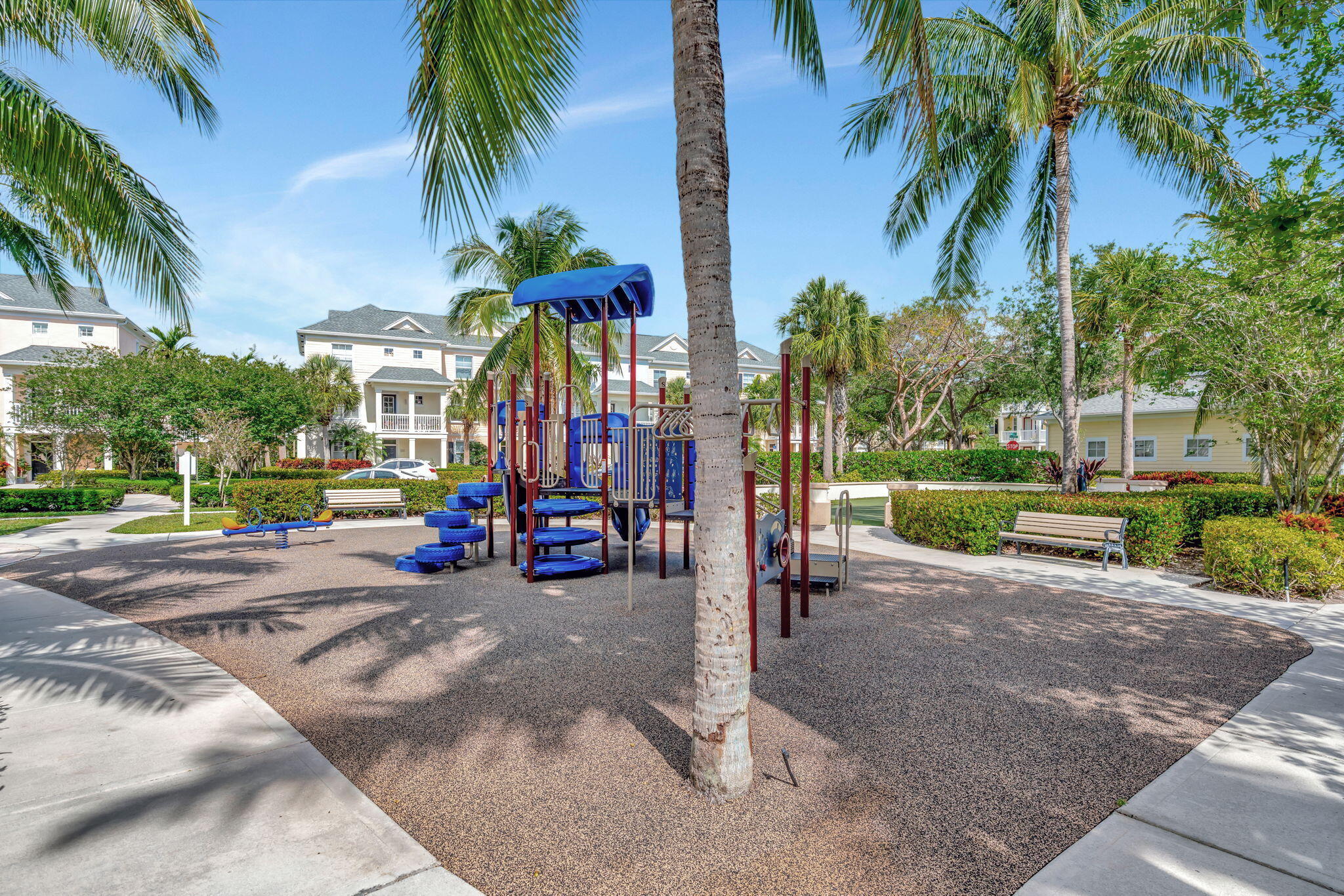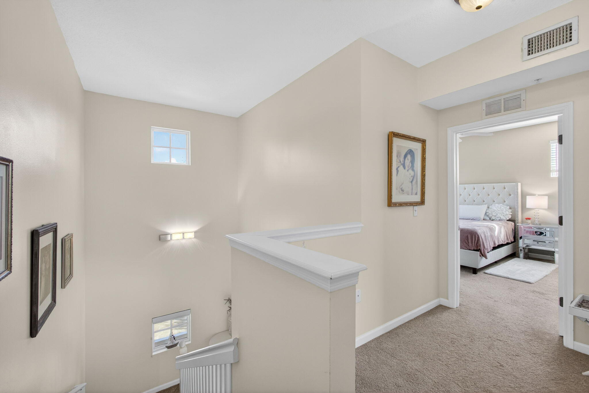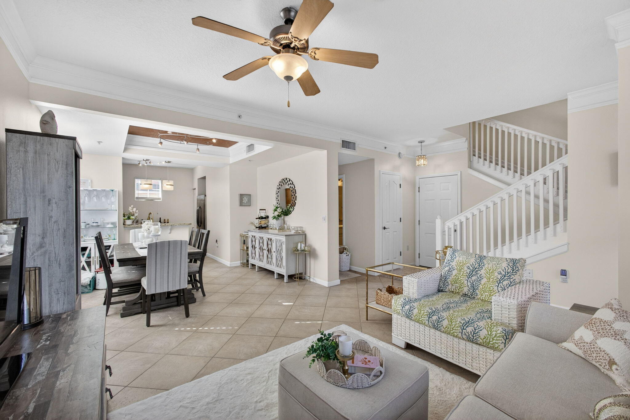 Corner-unit townhome in Abacoa features 3 floors of well-designed living with lots of windows and light. The ground level features a large flex room ideal for a home office, den, or gym, plus a two-car garage. Second floor showcases a large bedroom, a full bath and an open kitchen with stainless steel appliances, granite countertops, tiled backsplash, and wood cabinetry, flowing into a dining room highlighted by a copper tray ceiling and elegant wainscoting. The living room opens to a private balcony with a view of the pool. Crown molding adds refined detail throughout. The third floor offers two en suite bedrooms, a versatile loft, and convenient laundry. Hurricane-impact windows and doors throughout provide peace of mind and efficiency. Pool, gym and playground across the street.