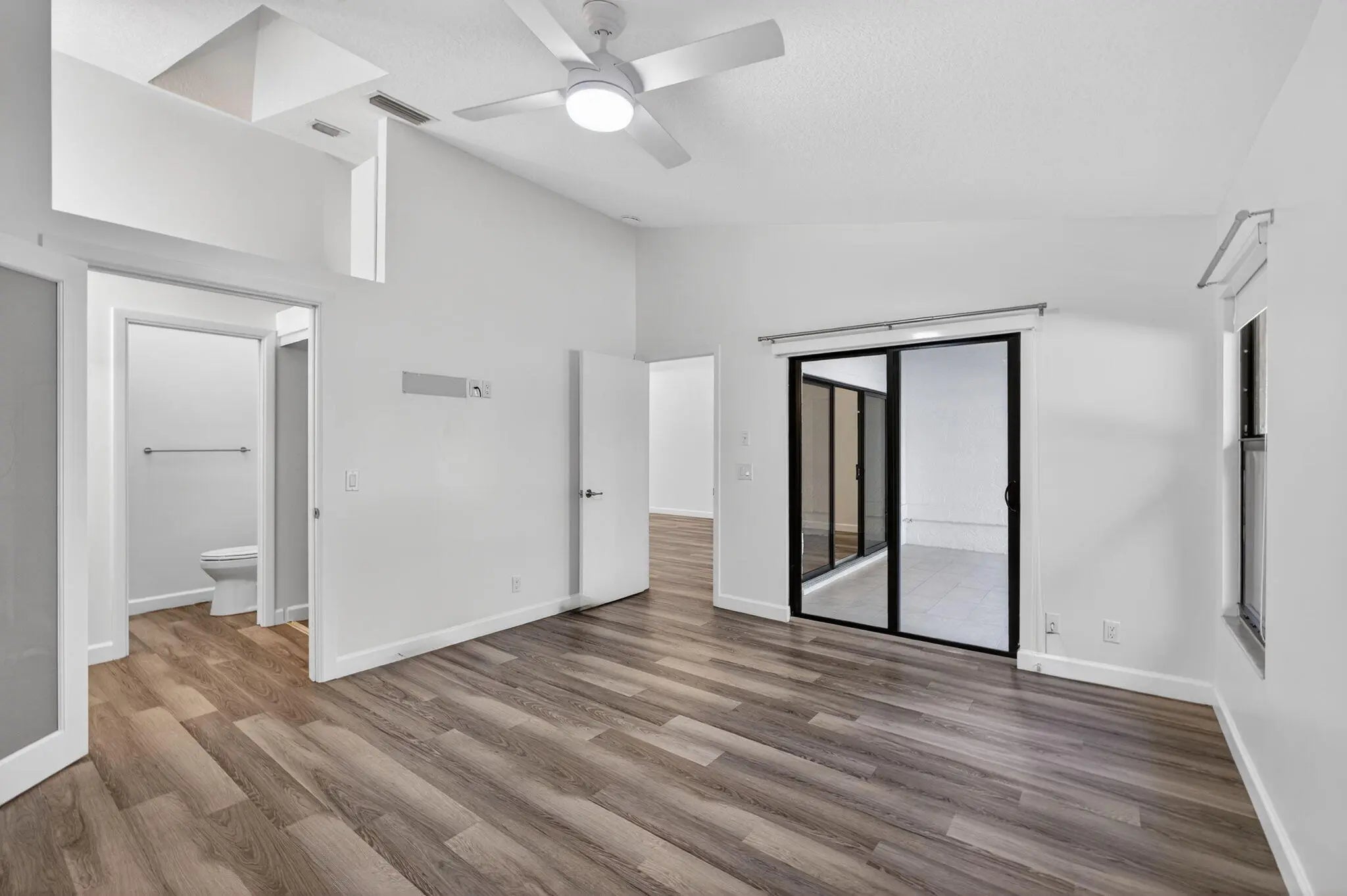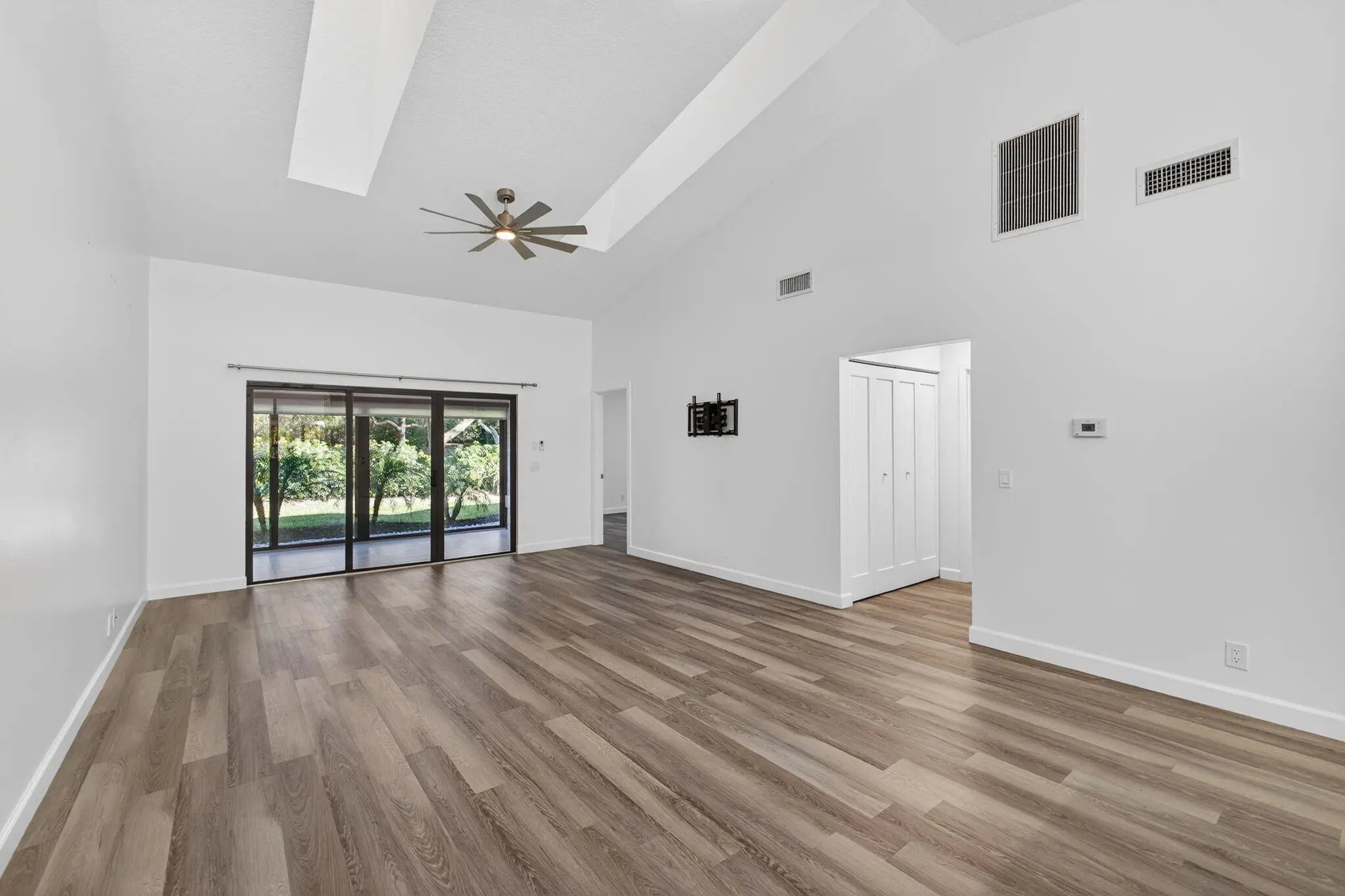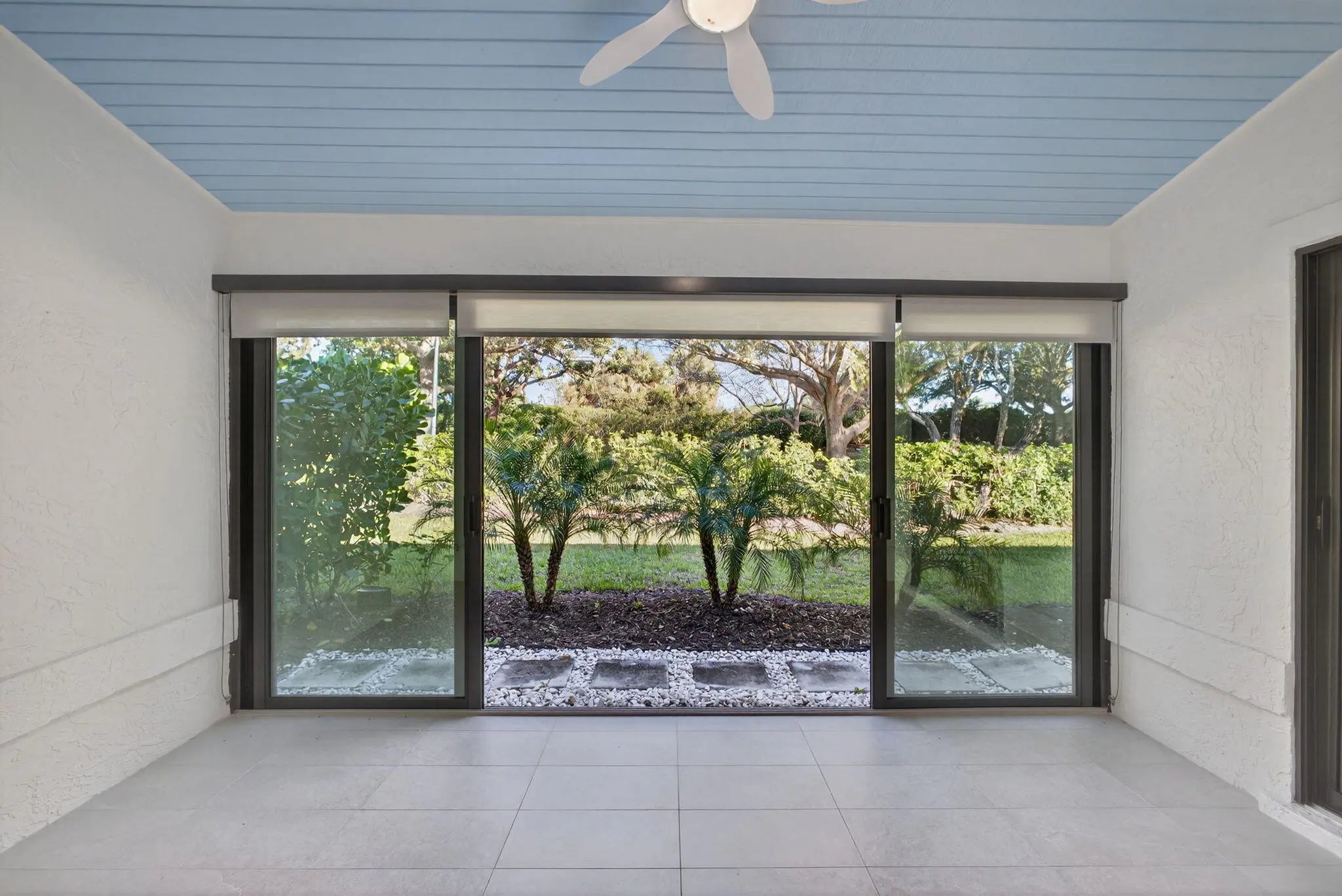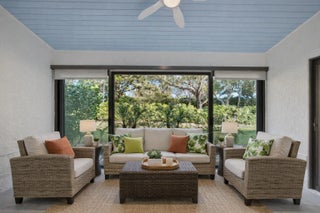 An unexpected delight! This stunning single-level, fully renovated townhouse offers a spacious layout with 2 bedrooms, 2 bathrooms, and a single-car garage featuring a brand-new door. Enjoy a brightly enclosed sunroom with hurricane-impact sliding glass doors and windows for peace of mind. Every detail has been thoughtfully updated - the home includes a newer AC system with added UV light system for cleaner air, custom blinds throughout, new microwave and refrigerator, updated doors, new washer and dryer, and upgraded plumbing. Custom closets with a remote-controlled Hunter Douglas retractable solar shade for the skylight add an elegant touch. This home is in pristine, move-in-ready condition--just bring your toothbrush! Roof assessment negotiable (new July 2025). A must-see property!