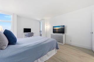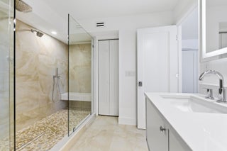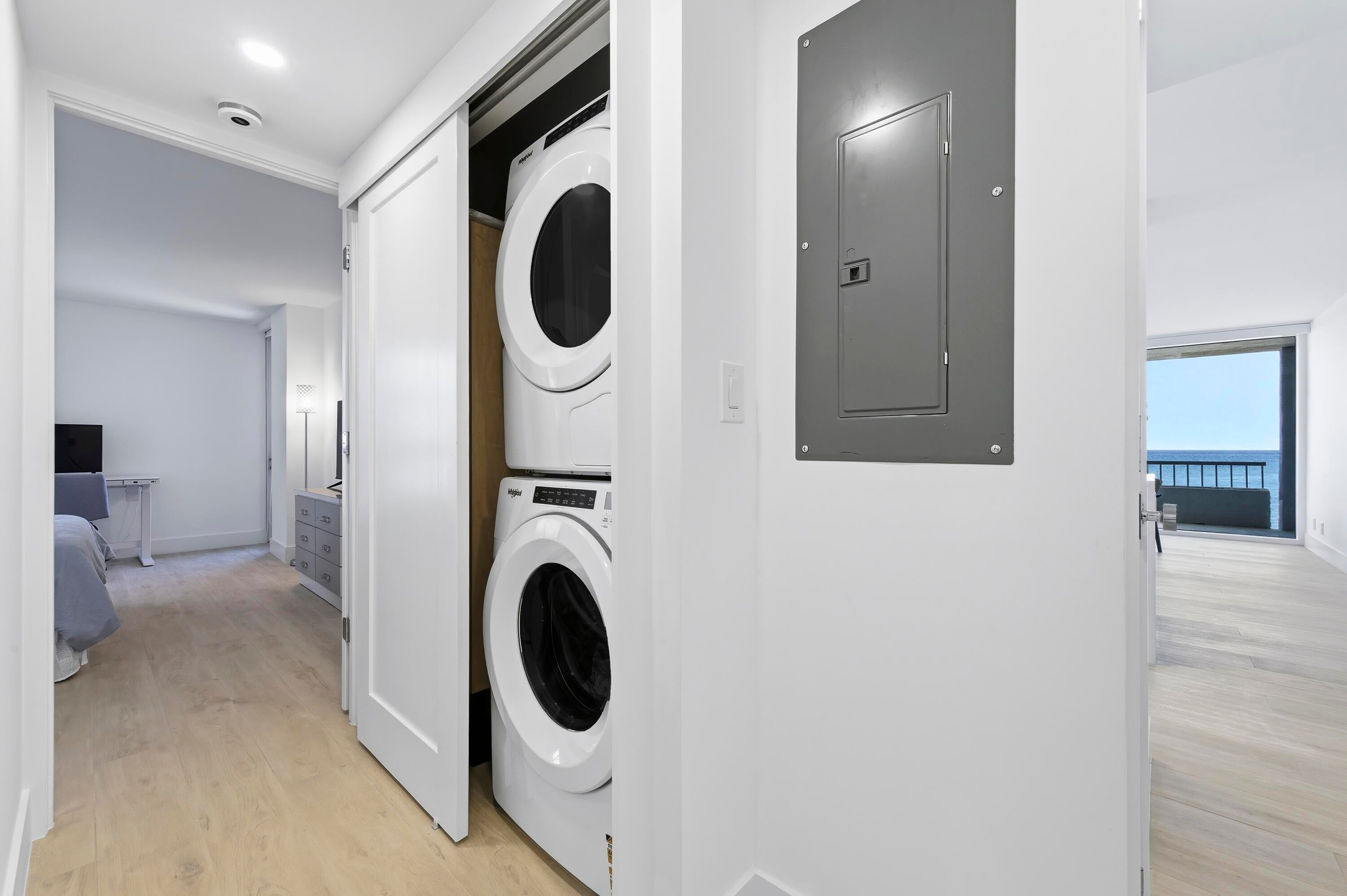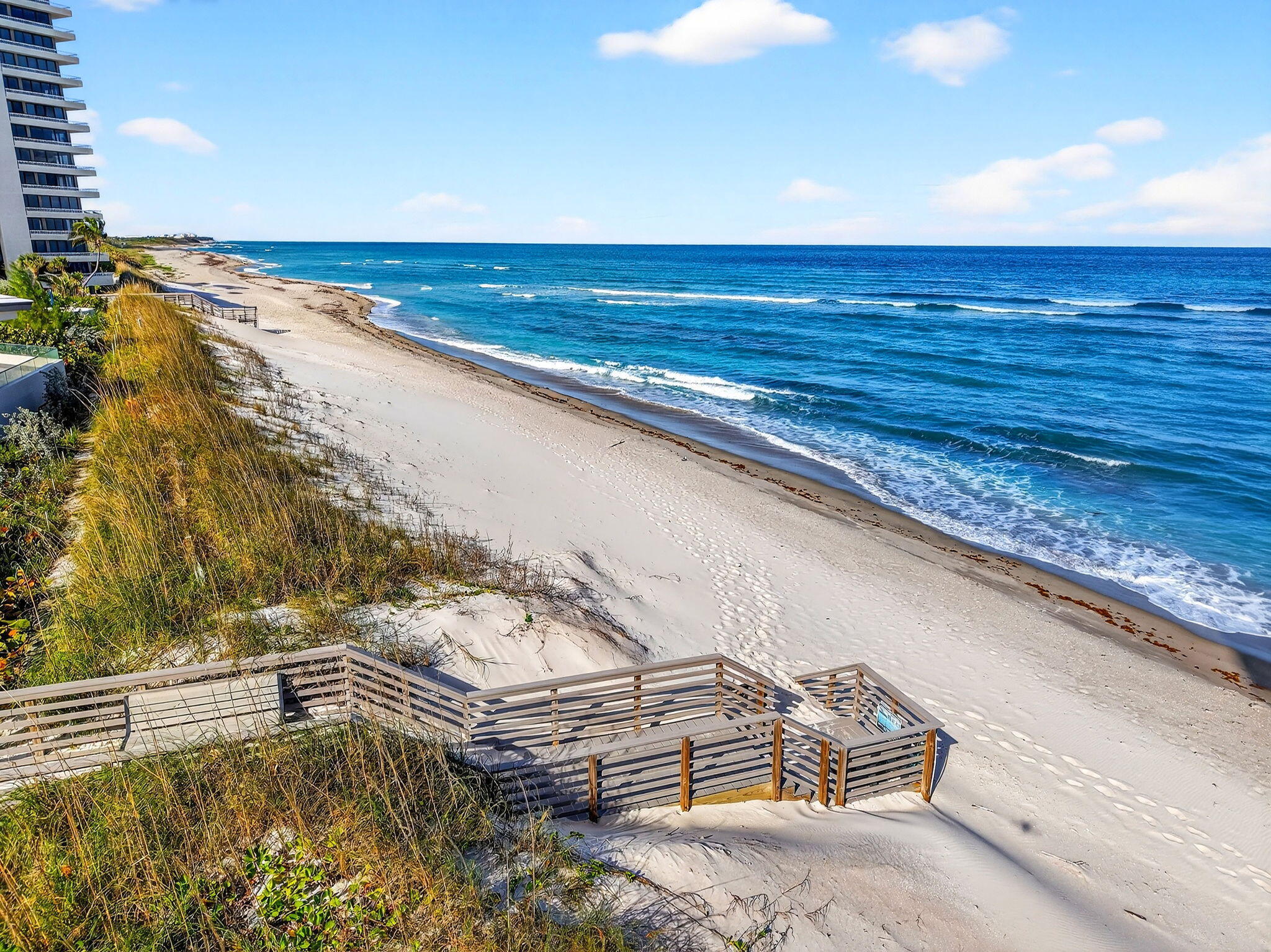 Designed with the ocean in mind, this stunning renovation is perfectly framed by direct Atlantic views. The ocean's blues and sandy coastline complement the timeless design, premium materials, and elevated finishes throughout.Step into a light-filled, open living space surrounded by floor-to-ceiling, high-impact glass. This 2-bedroom, 2-bath condominium has been completely redesigned with a clean, modern aesthetic and thoughtful upgrades at every turn. Wood-look tile flooring enhances the coastal feel, while the open living and dining areas are framed by sweeping direct ocean views from every seat. A fireplace adds warmth and architectural presence, a rare feature in oceanfront condos.The custom kitchen, built for both style and function, features a waterfall-edgequartz island, soft-close cabinetry, sleek hardware, and a polished backsplash that ties it all together. A full suite of Bosch appliances includes a built-in oven, induction cooktop, dishwasher, and refrigerator. Extended cabinetry incorporates a dedicated wine cooler, creating the perfect balance of performance and sophistication. The primary suite is a true retreat with a custom closet system enhanced by motion lighting and a spa-inspired bath. Highlights include an expansive double shower with 2 built-in benches, dual shower wands, and an additional 14" rainwater shower head, double sinks, and a vanity with under-counter lighting. The guest bathroom is beautifully updated with the same high-end finishes. Additional upgrades include motorized blinds, three televisions, and a full-size Whirlpool washer and dryer. Water Glades is an oceanfront, guard-gated community on the preferred north end of Singer Island, set on over 11+ acres with private beach access and beautifully maintained grounds beside MacArthur State Park for added privacy and protected natural beauty. Residents enjoy two heated pools, an oceanfront clubhouse with a large social room, fitness center, library, tennis and pickleball courts, on-site management, and 24-hour manned security. Minutes to Palm Beach Gardens, PGA Boulevard, Worth Avenue, and Palm Beach International Airport, this is refined oceanfront living with effortless access to everything that matters.