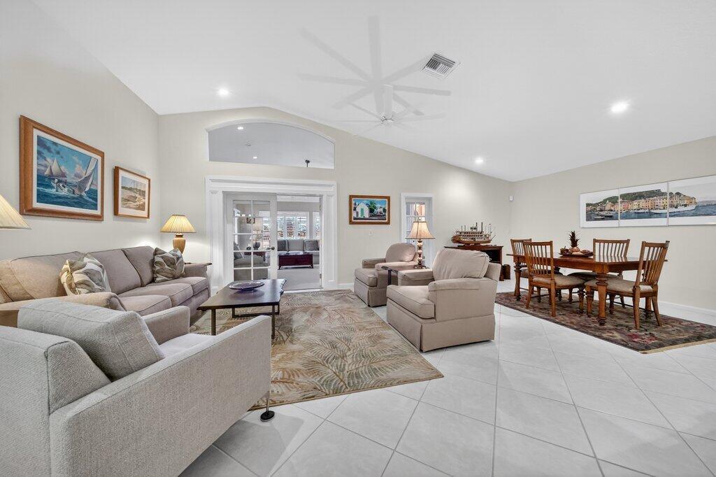 Lakefront single story charmer in desirable Willoughby Glen. Built in 2002, this popular 2 possible 3-bedroom home features a spacious great room layout and an impressive custom addition built in 2008. This addition is complete with French doors, impact glass, full bath, large closet space offering versatility and comfortable living space. Currently utilized as a gathering/TV room, this flexible space is ideal for a 3rd ensuite bedroom, extended family living, game room, hobby area or more. Tile on the diagonal throughout living area, vaulted ceilings, eat in kitchen with a movable island and abundant storage, natural gas water heater, dryer and piping for gas stove and outdoor kitchen, plantation shutters throughout, whole house generator. 2024 metal roof, refinished screened patio withrefinished screened patio with new pavers, and fenced yard. Beautiful landscaping frames the wide lake view, creating a peaceful backdrop for everyday living. Warm, inviting, and impeccably maintained in a sought-after community.