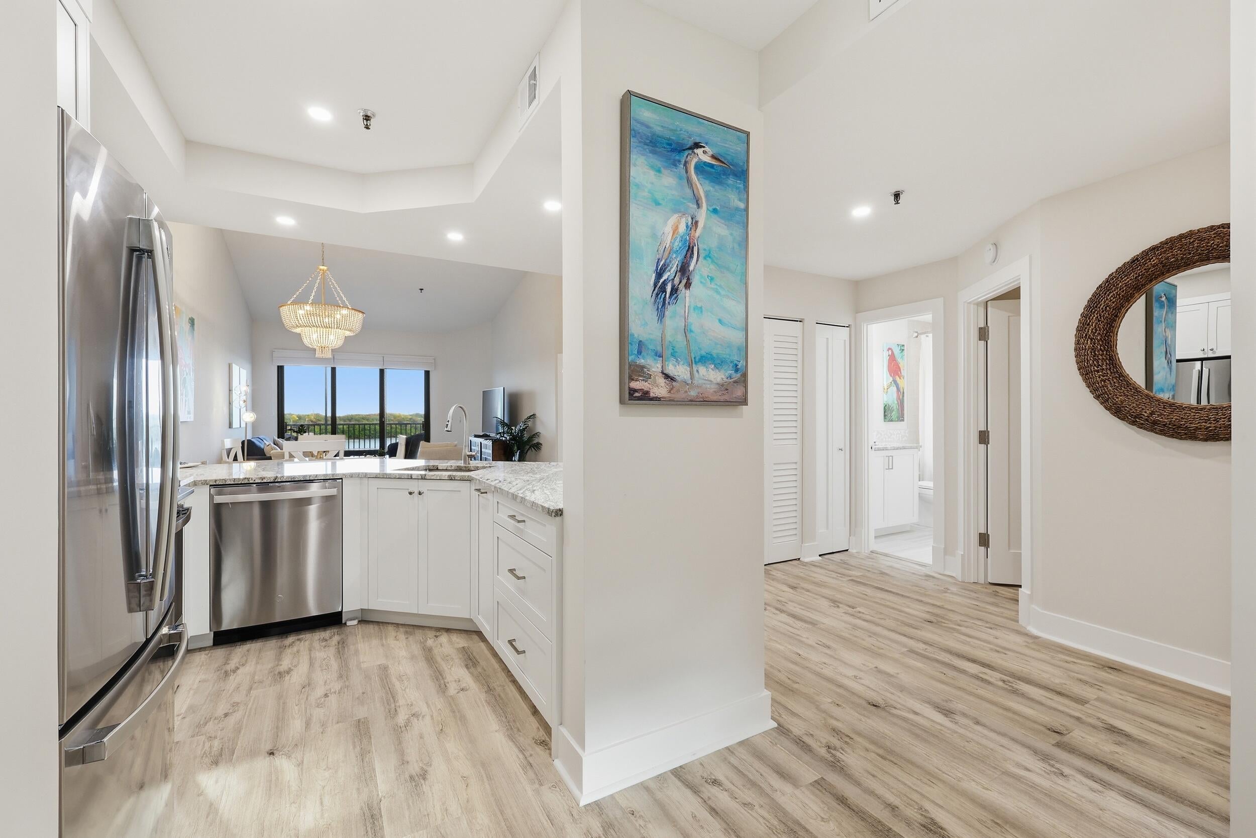Beautifully updated 2-bedroom, 2-bathroom waterfront condo located on the third floor along the Intracoastal Waterway in Tequesta. This residence offers panoramic water views and high ceilings that enhance the light and open feel. Renovations include luxury vinyl flooring (2021), new paint and trim work, an updated kitchen and bathrooms, impact sliding glass doors and windows and new A/C (2023). The community features a serene pool and day docks for boaters with direct Intracoastal access. Designated, covered parking and ample guests spaces available. Ideally situated within walking distance to Tequesta's restaurants and shops, offering a convenient coastal lifestyle in a quiet, well-maintained setting.